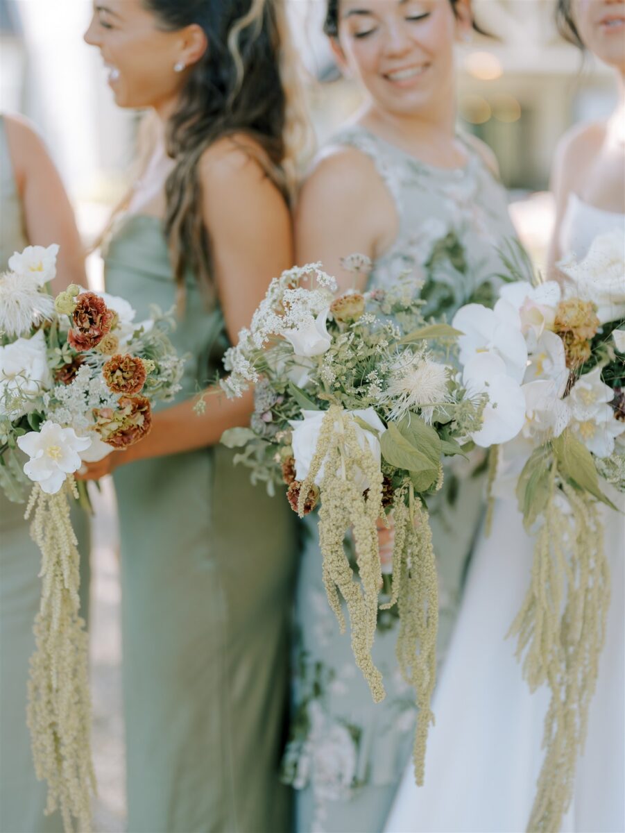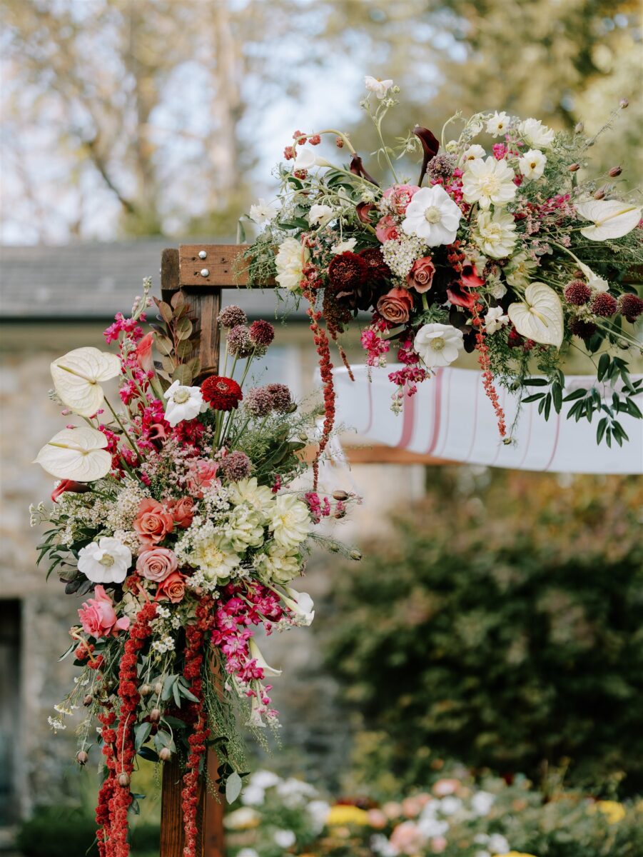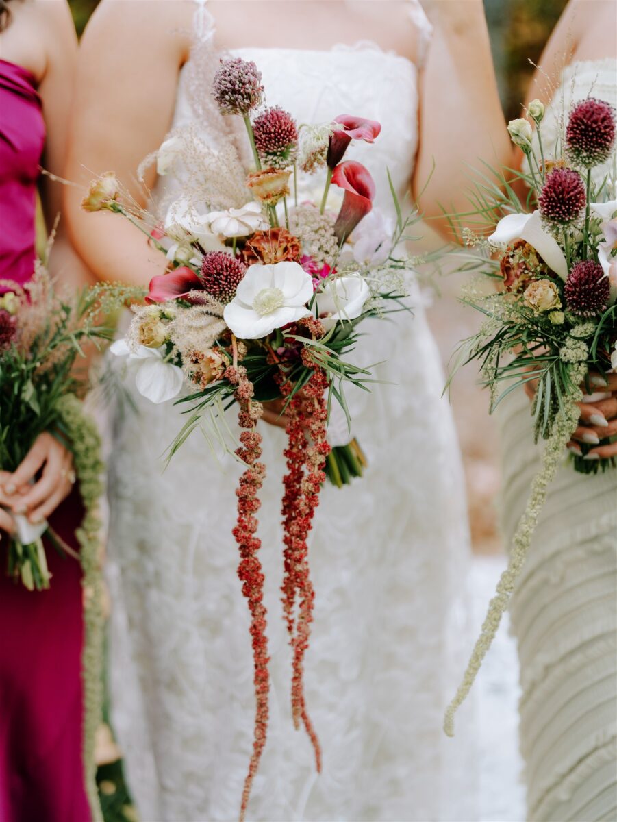 Dramatic floral palettes add depth and contrast. Hanging amaranthus in bouquets adds movement, while moss-forward florals introduce texture and an organic edge. These choices let your florals feel modern, artful, and tailored to your style.