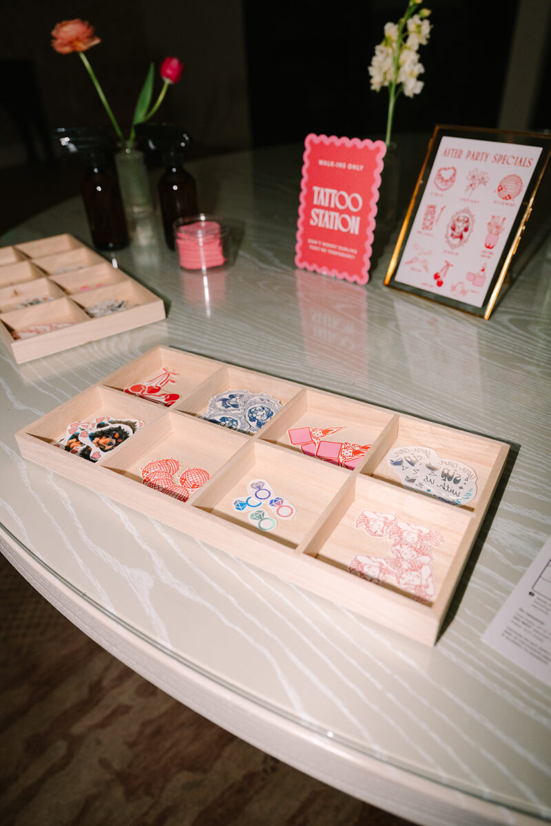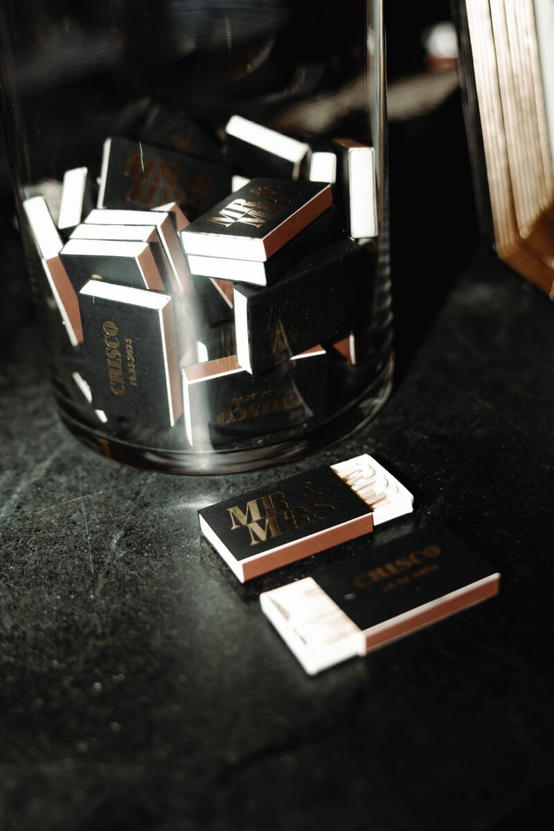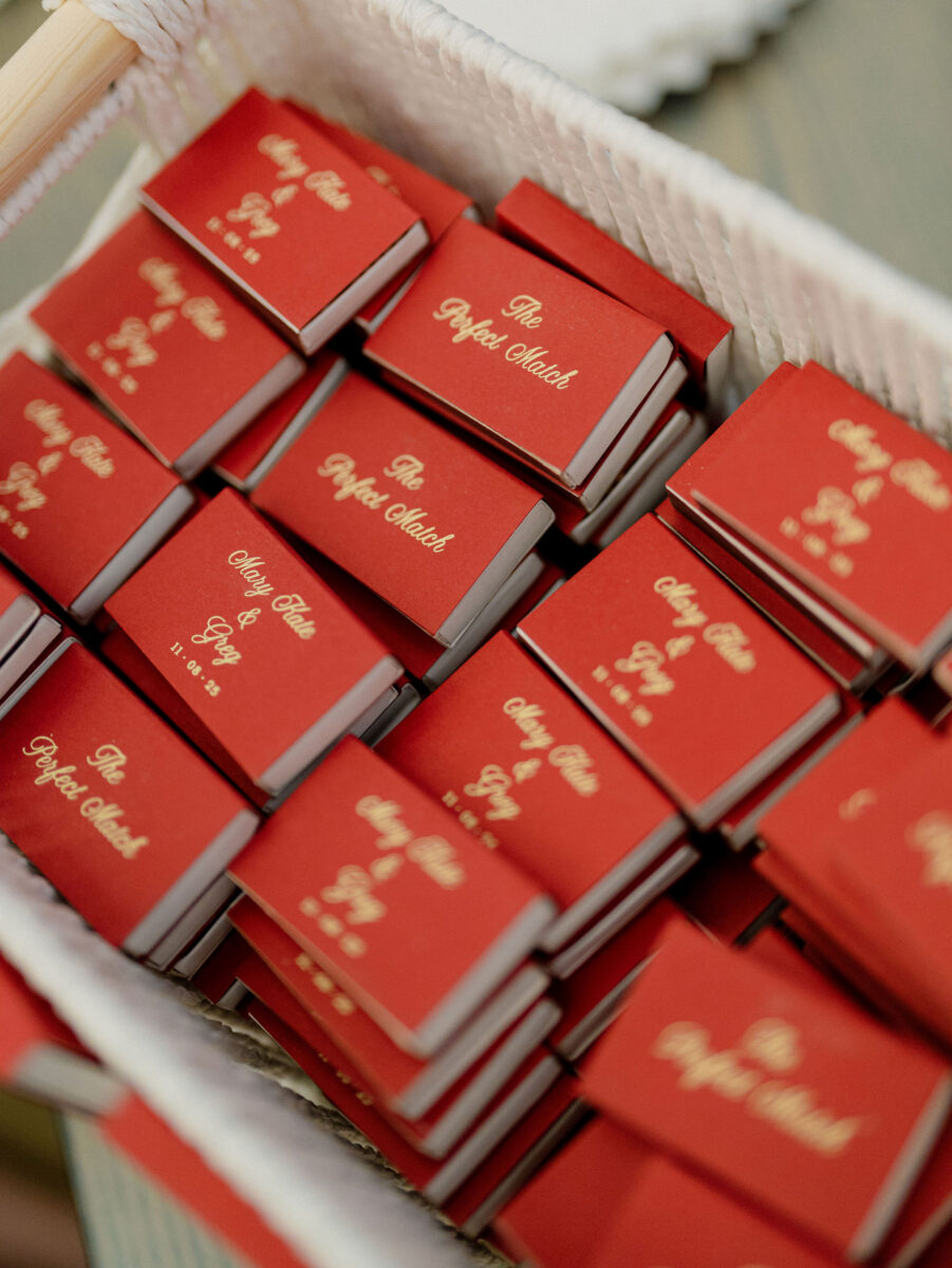 Personal details woven into decor and keepsakes are also trending. Custom temporary tattoos and LEGO florals add a playful twist. Custom matchboxes remain a timeless guest favorite.