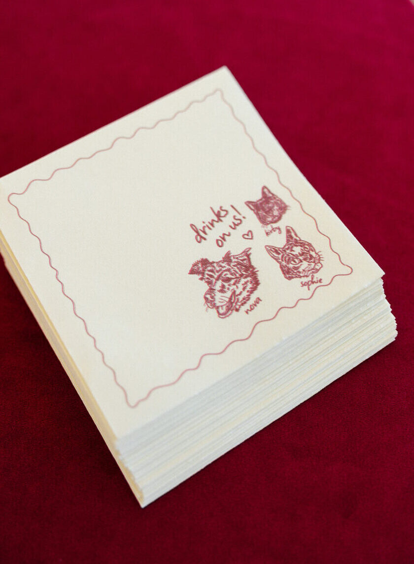 Even tabletop details are becoming storytelling moments. From thank you napkins to pet portraits, small touches like these leave a lasting impression. Interactive elements like ‘Wedding Jeopardy’ trivia cards invite guests to engage and have fun while celebrating the couple, making each table a unique experience.