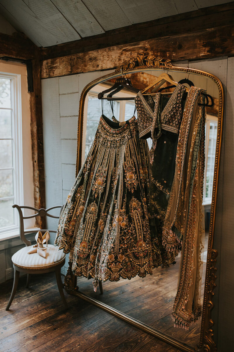 The entire day felt like a celebration of culture, color, and connection. Surrounded by their favorite people, they blended traditions seamlessly. For the morning baraat and Hindu ceremony, Miten wore a traditional embroidered Kora sherwani that complemented Shannon’s heavily beaded Kalki olive green velvet lehenga. Shannon changed into a gorgeous Galia Lahav ballgown with black bow details at the shoulders, and Miten swaped into a custom-fitted black suit for their second look and ceremony.