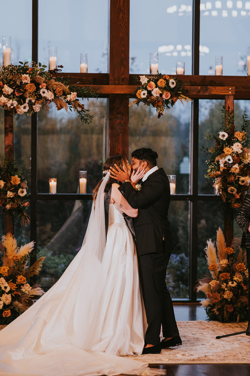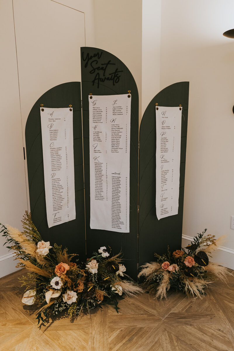 Their menu focused on Indian fusion, blending the couple’s favorite flavors with cultural hors d’oeuvres and entrees. Representing their love for fall, the florals shifted from soft autumnal tones of blush and cappuccino roses with dried textures to moodier after-dark arrangements featuring black anthurium and anemone blooms, transitioning the atmosphere from golden to moody as the sun set. A rosé champagne tower, disco ball details at the sweetheart table, and custom “’til death” jean jacket details reflected their style, story, and traditions.