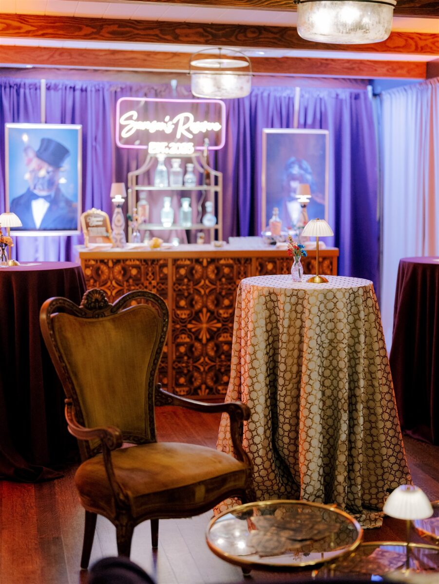 Hidden behind velvet drapes, ‘Samon’s Reserve’ named after Matt’s childhood dog, transported guests into a world of vintage glamour. Christine from Click It Event Planning, the couple’s planner, curated the space with a custom fabric bar, vintage lounge furniture, framed portraits of their pups, drapery, lighting, and LEGO bud vases. Lauren’s personal touches, including guest checks, tarot cards, and loose change scattered on the tables. The speakeasy curtains opened after dinner, inviting guests into the exclusive, intimate atmosphere, and quickly became the guests’ favorite hideaway.