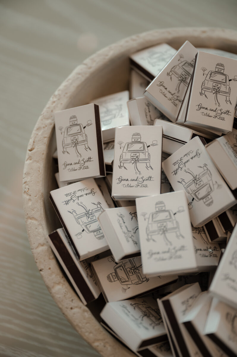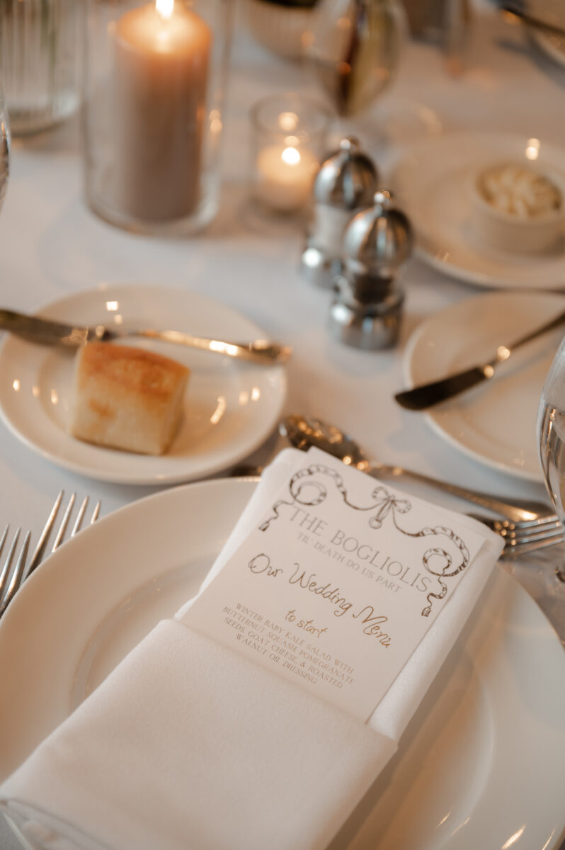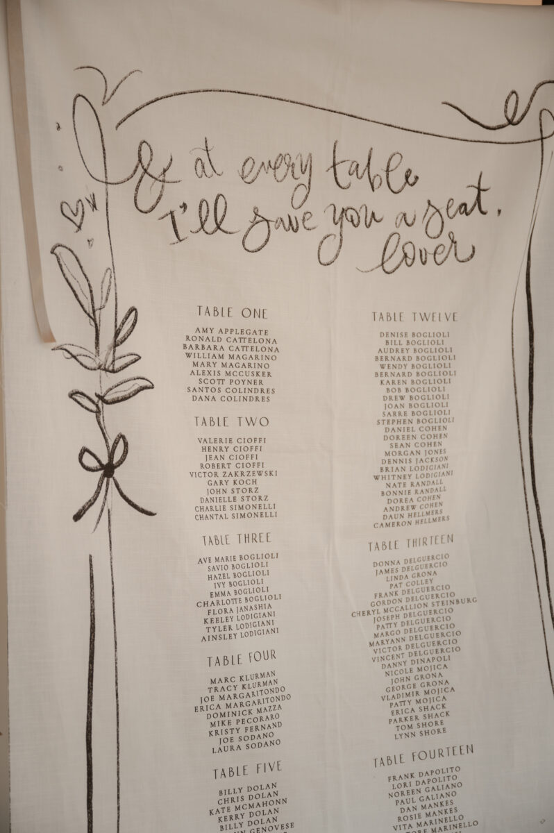 Gina was all about nailing the little details, and we were here for it. Custom matchboxes, menus, and napkins? Check. Roman busts, fruit-studded centerpieces, and an All Too Well quote on the welcome sign? Double-check. In true Swiftie fashion, Gina’s seating chart featured lyrics from Lover—a perfect personal touch.