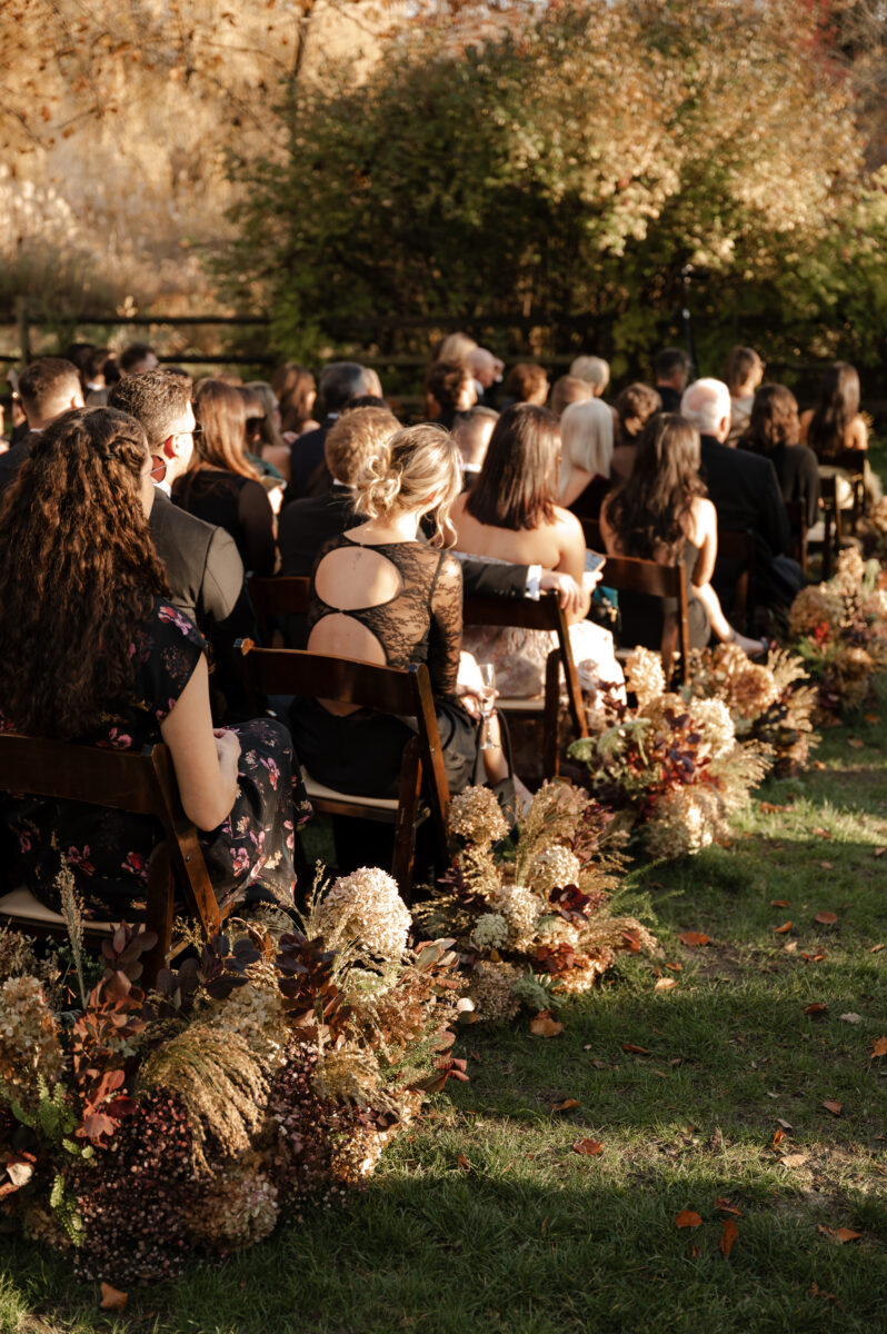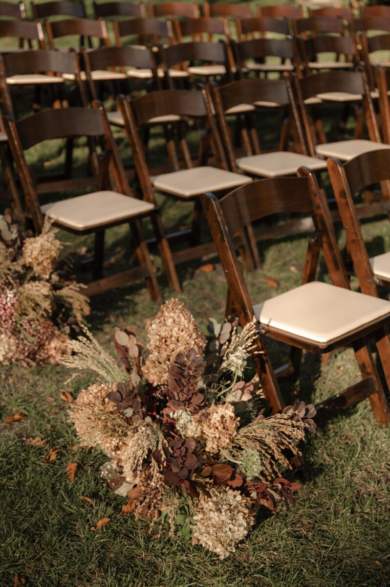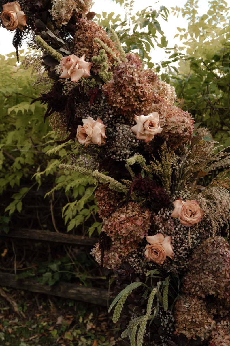 Our team crafted a blend of moody tones with natural elegance, using estate-grown and dried hydrangeas, anthuriums, amaranthus, and rich textures to add a serious dose of drama. Gina’s ceremony aisle was a lush blend of florals, grasses, and smoky foliage—painting a picture of non-traditional romance with mauve-toned hydrangeas and painted baby’s breath.