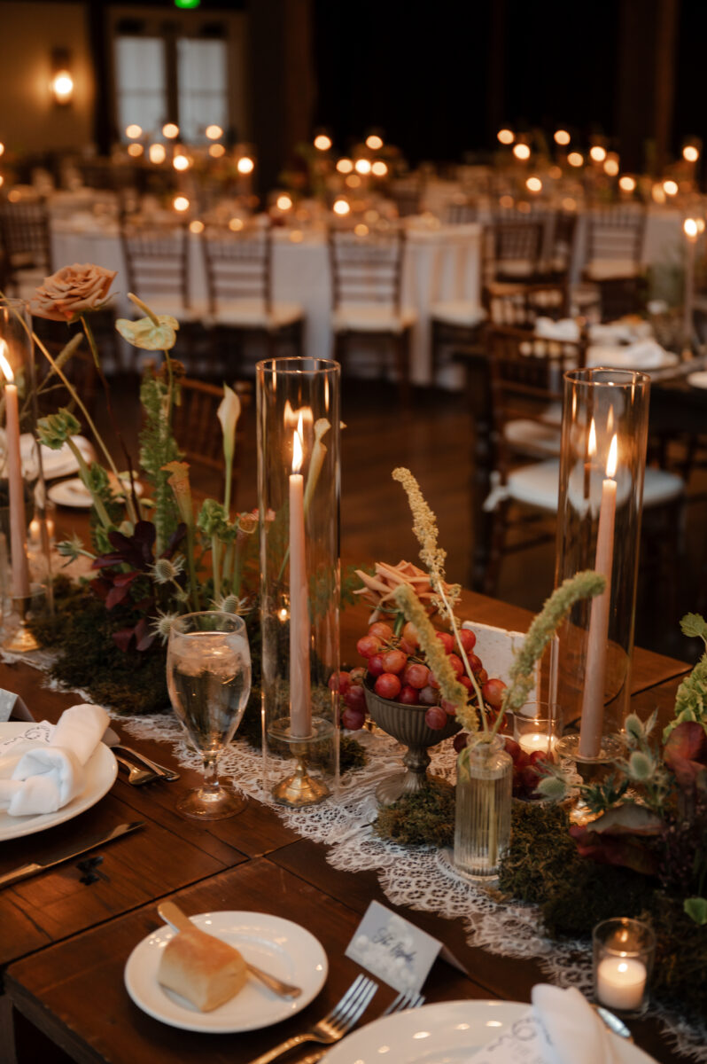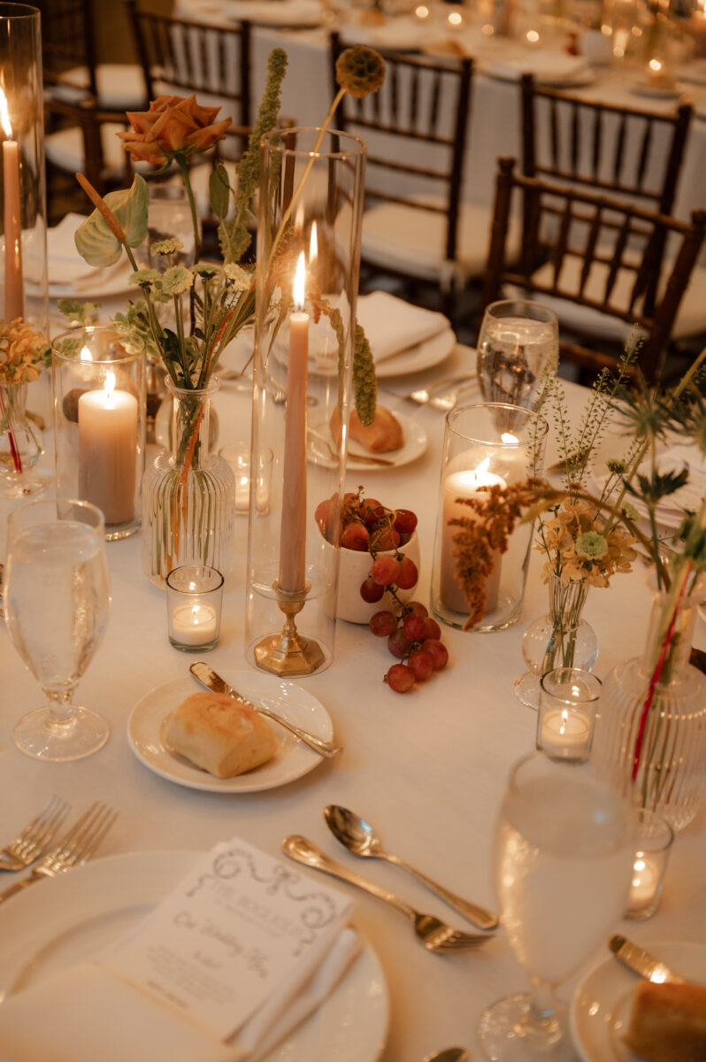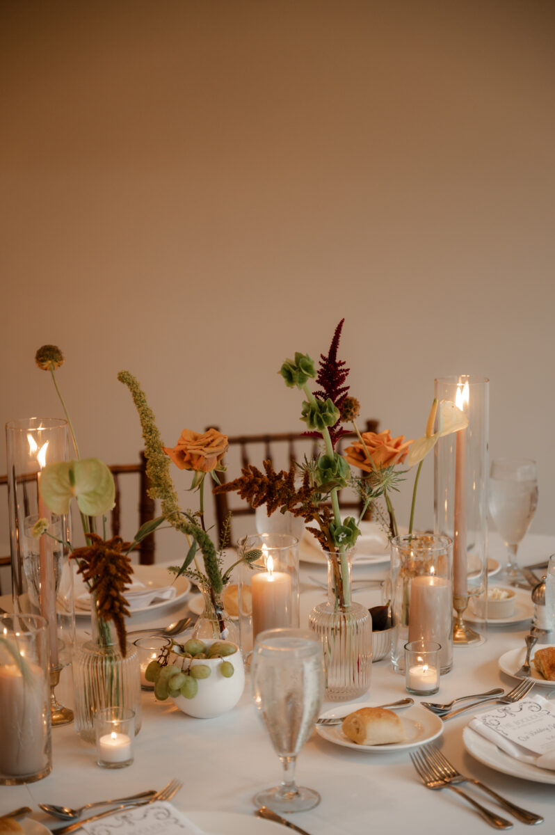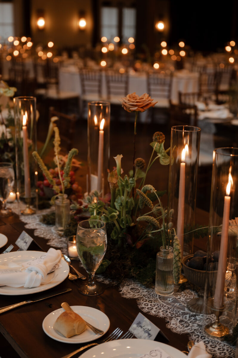 The color scheme blended dark, moody elements with vibrant, airy accents, crafting a layered atmosphere that felt both luxurious and edgy. Centerpieces included bud vases, textured bowls with grapes and figs, taupe taper candles, and floral runners that repurposed aisle decor on lace runners. The head table details highlighted a floral runner of bud vases, gold fruit bowls, and candles, casting a beautiful glow as night fell.
