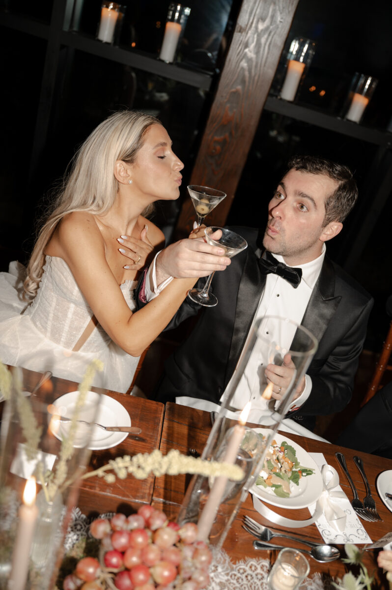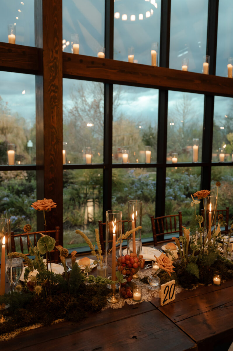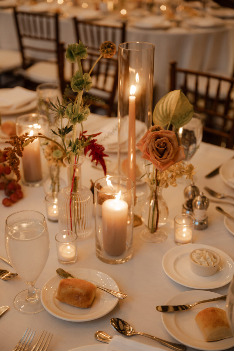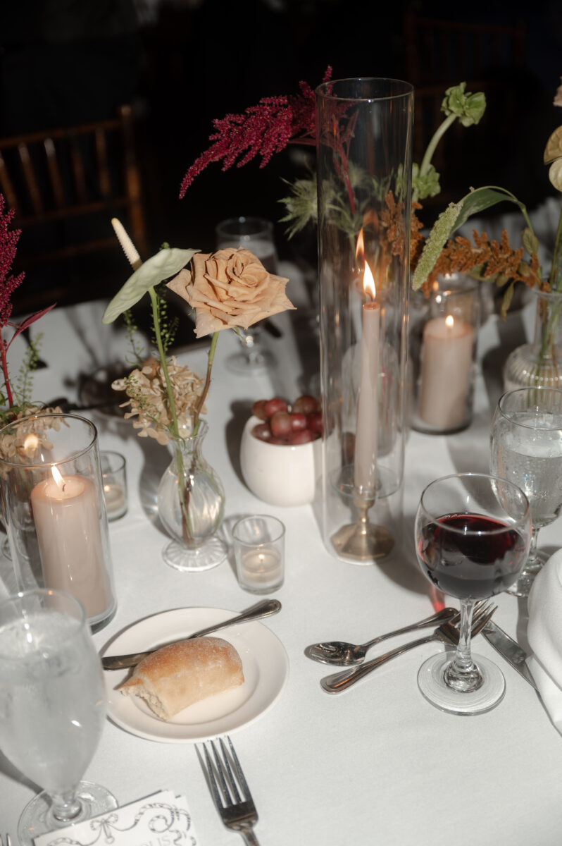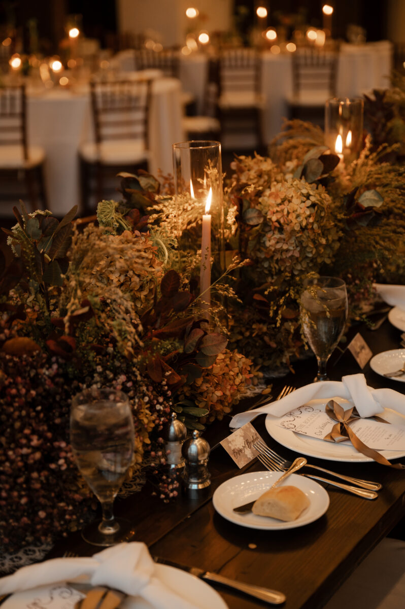The color scheme blended dark, moody elements with vibrant, airy accents, crafting a layered atmosphere that felt both luxurious and edgy. Centerpieces included bud vases, textured bowls with grapes and figs, taupe taper candles, and floral runners that repurposed aisle decor on lace runners. The head table details highlighted a floral runner of bud vases, gold fruit bowls, and candles, casting a beautiful glow as night fell.