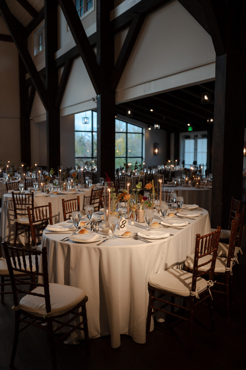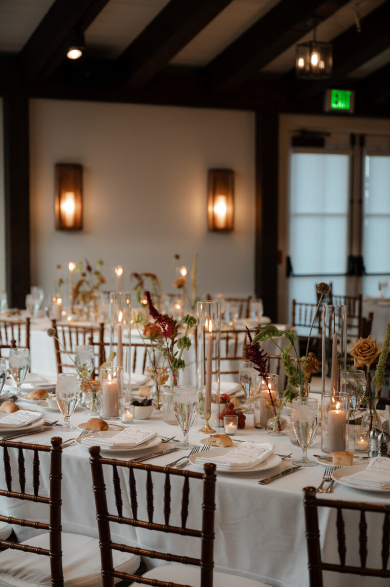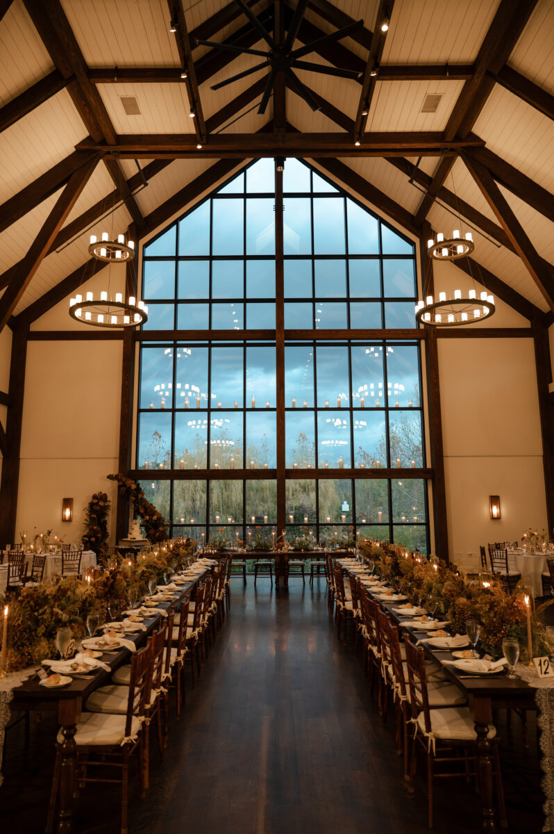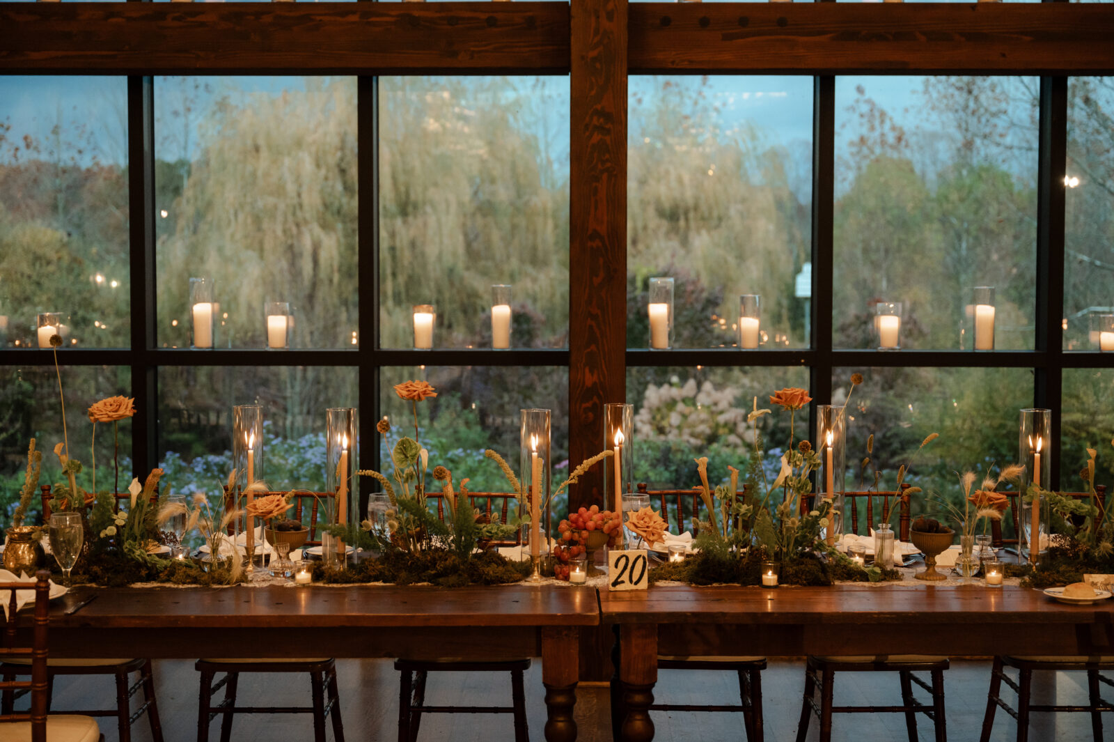 The color scheme blended dark, moody elements with vibrant, airy accents, crafting a layered atmosphere that felt both luxurious and edgy. Centerpieces included bud vases, textured bowls with grapes and figs, taupe taper candles, and floral runners that repurposed aisle decor on lace runners. The head table details highlighted a floral runner of bud vases, gold fruit bowls, and candles, casting a beautiful glow as night fell.
