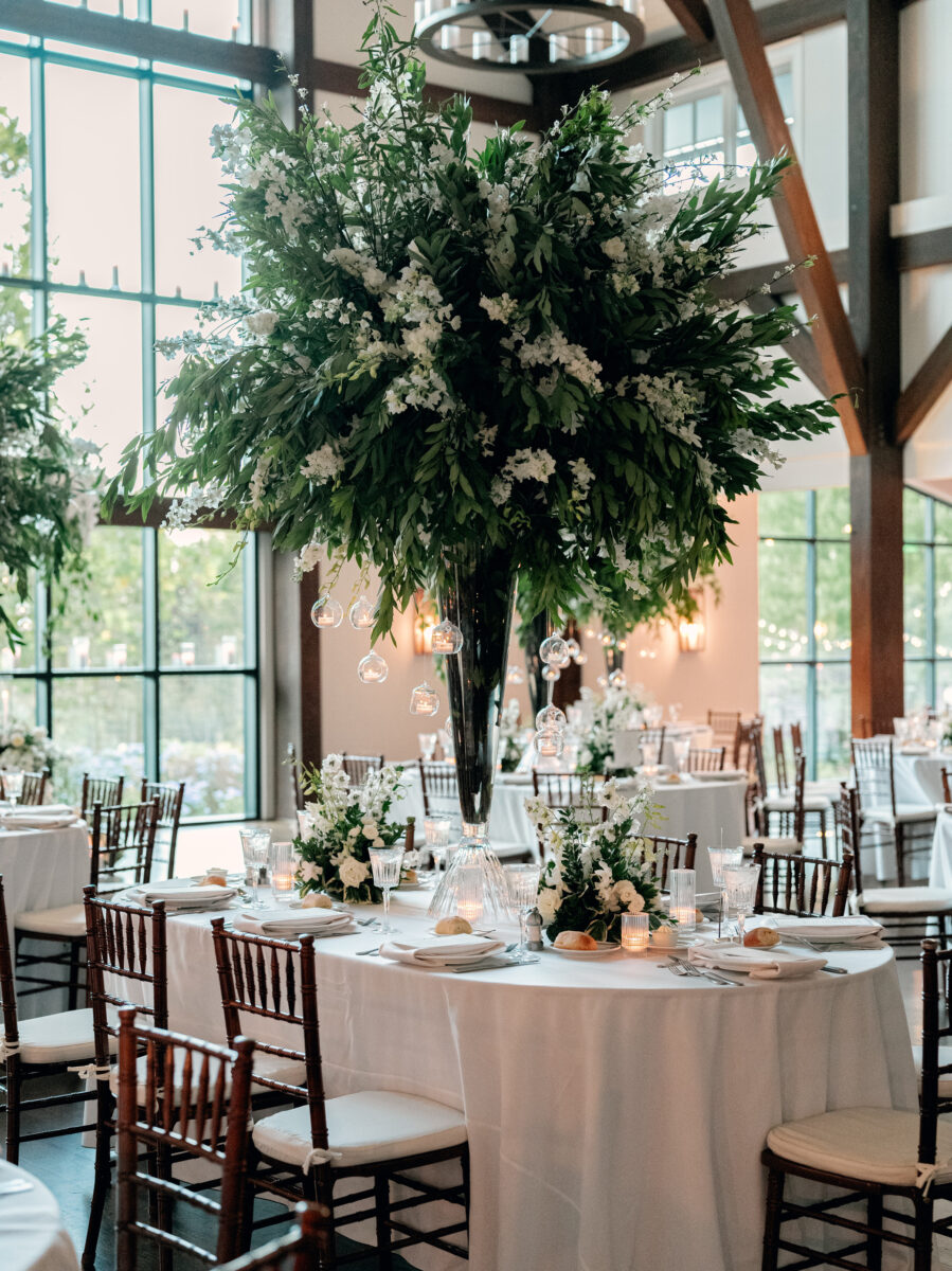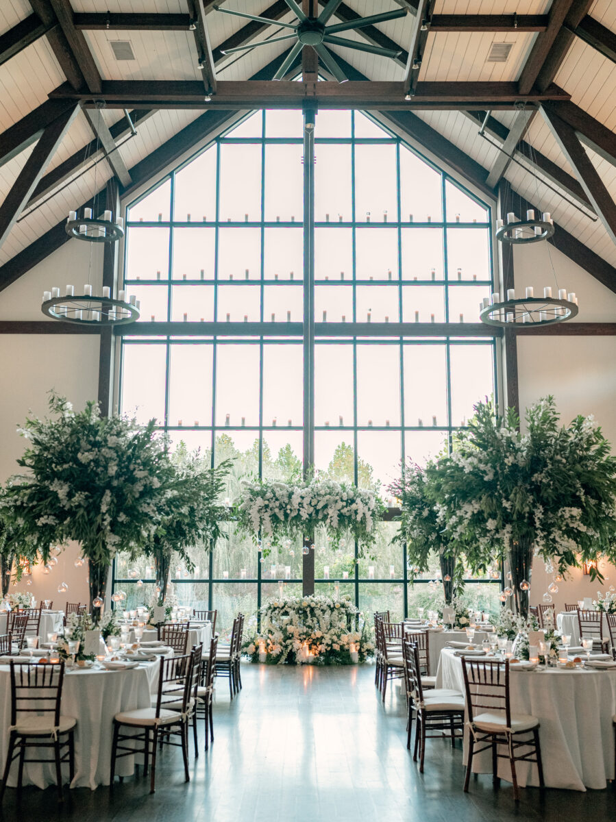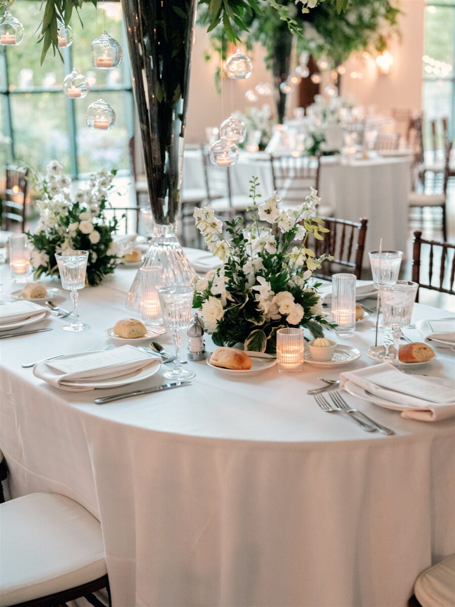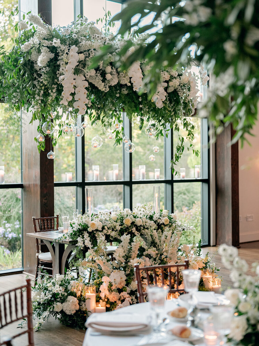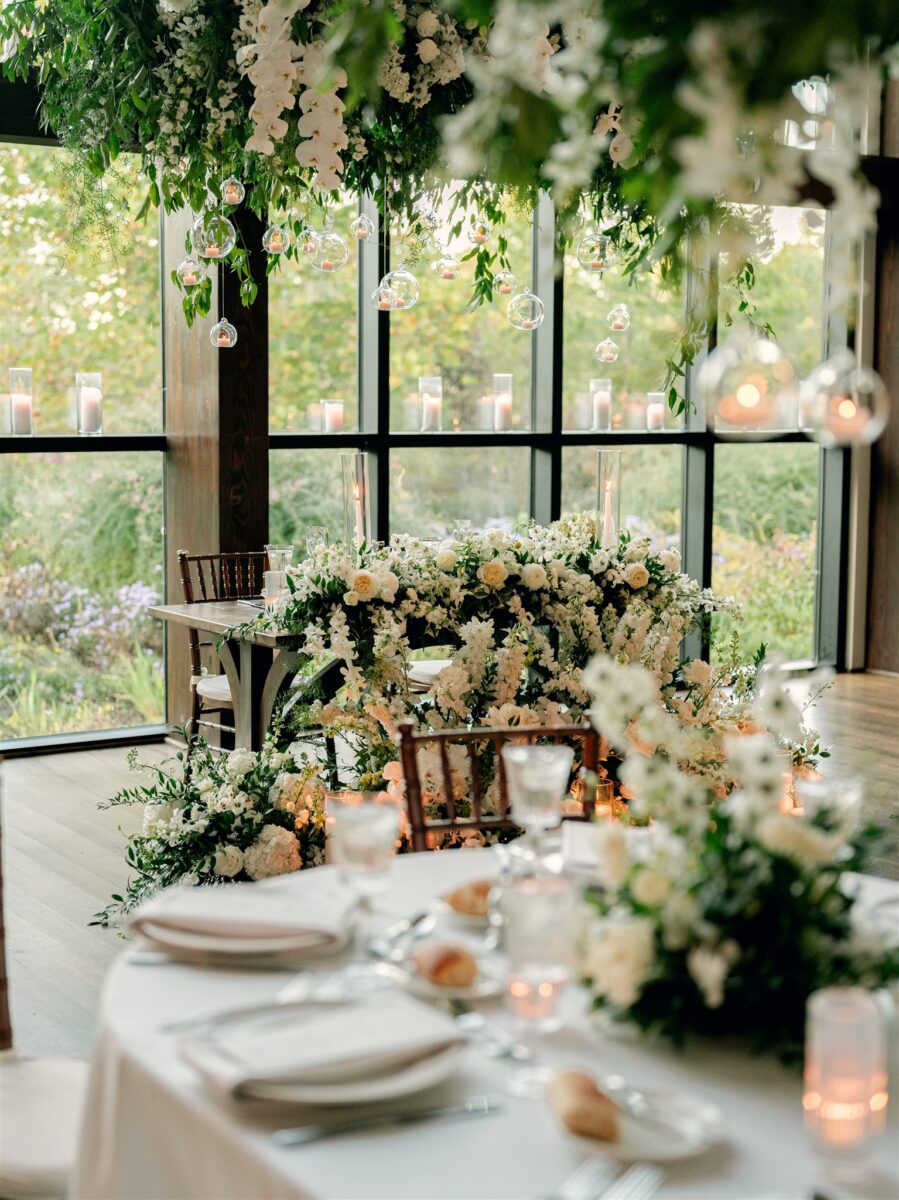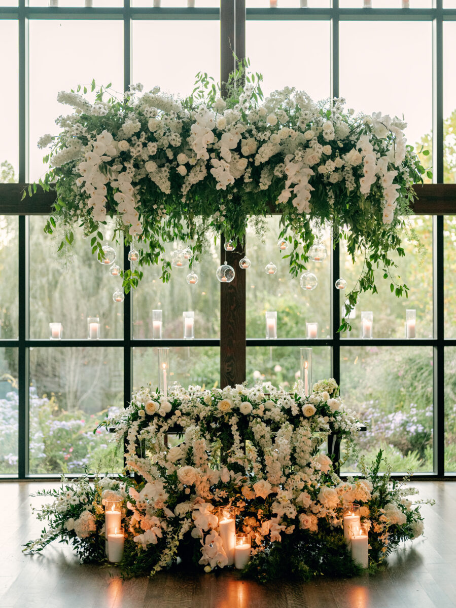 Stepping into the reception, the air was filled with the scent of fresh florals, with the space transformed with towering tree-like centerpieces of bay laurel, myrtle, Italian ruscus, white delphinium, orchids, and stock. Suspended candles cast a warm, romantic glow throughout the evening. A gravity-defying floral installation, by Crossed Keys Designs suspended above the sweetheart table. Hundreds of candles illuminated the reception, including the estate’s soaring 45-foot windows.