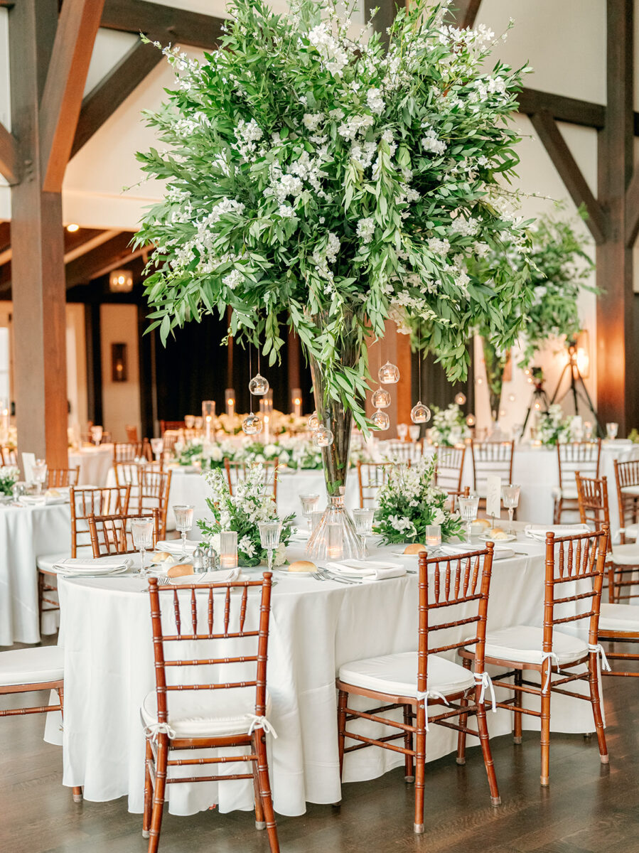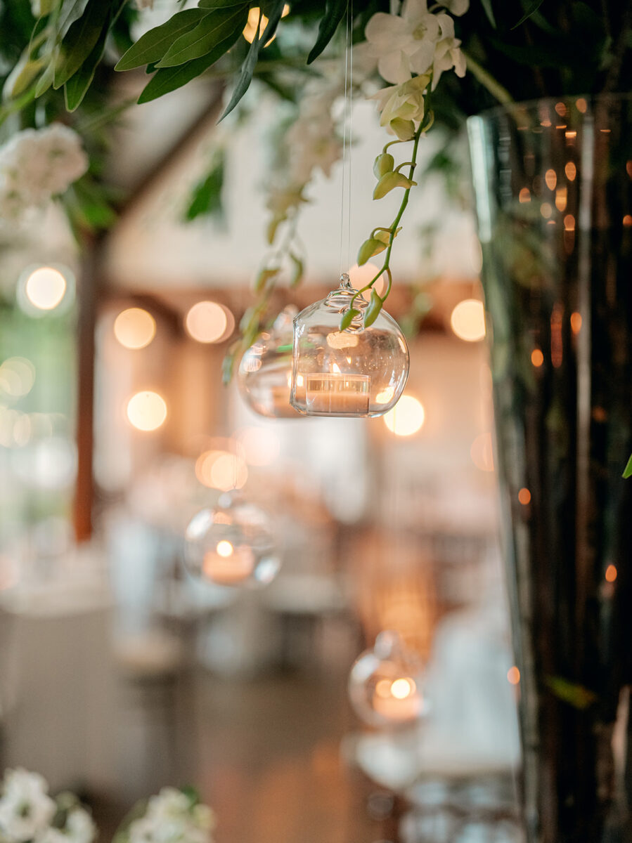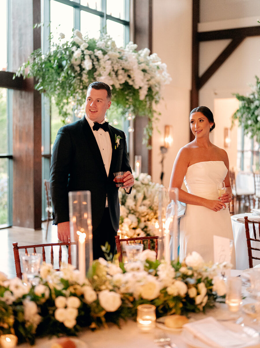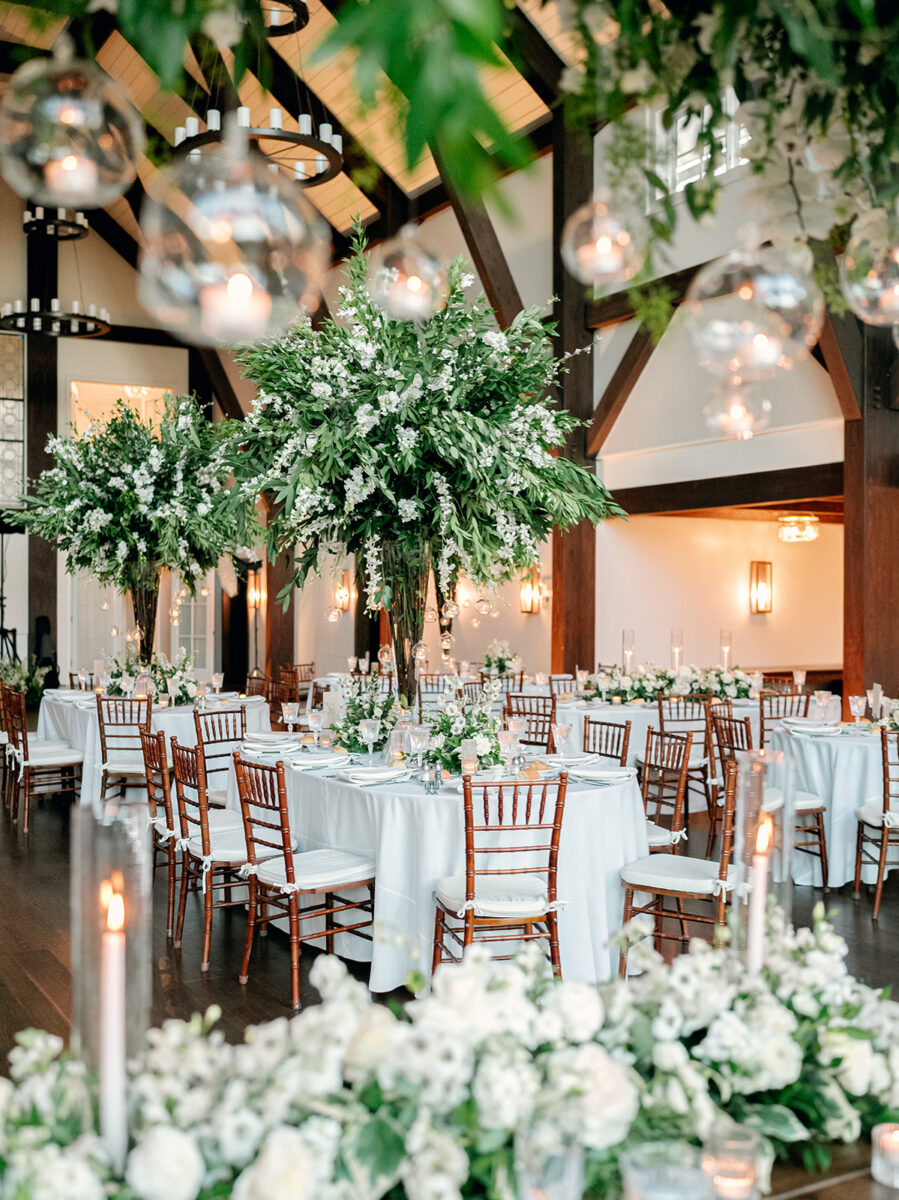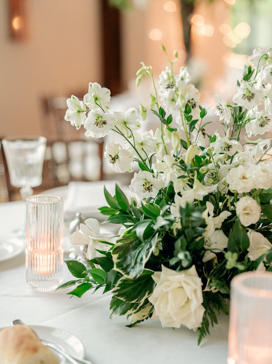 Stepping into the reception, the air was filled with the scent of fresh florals, with the space transformed with towering tree-like centerpieces of bay laurel, myrtle, Italian ruscus, white delphinium, orchids, and stock. Suspended candles cast a warm, romantic glow throughout the evening. A gravity-defying floral installation, by Crossed Keys Designs suspended above the sweetheart table. Hundreds of candles illuminated the reception, including the estate’s soaring 45-foot windows.