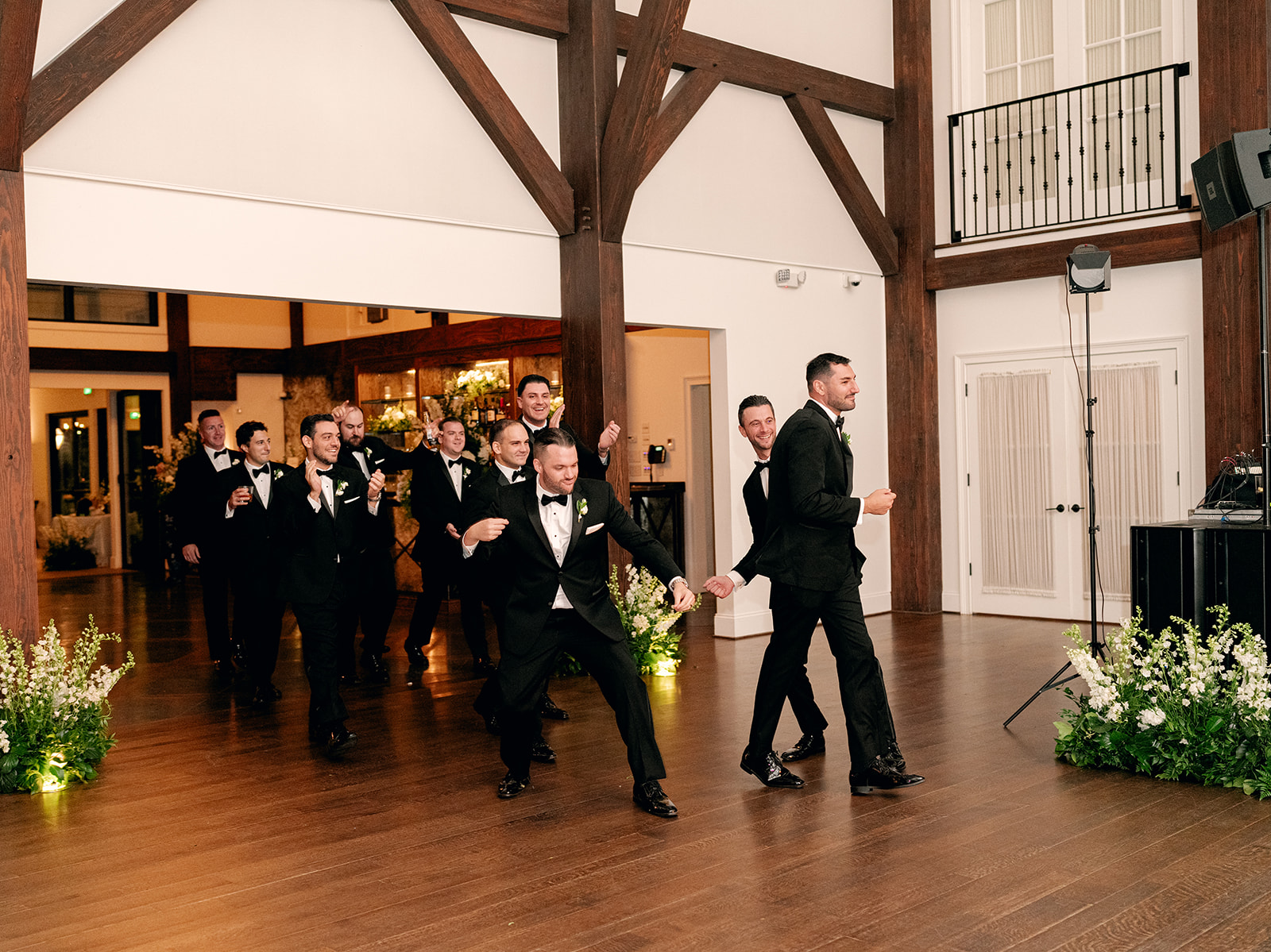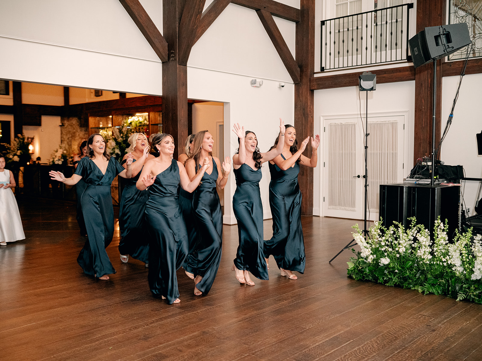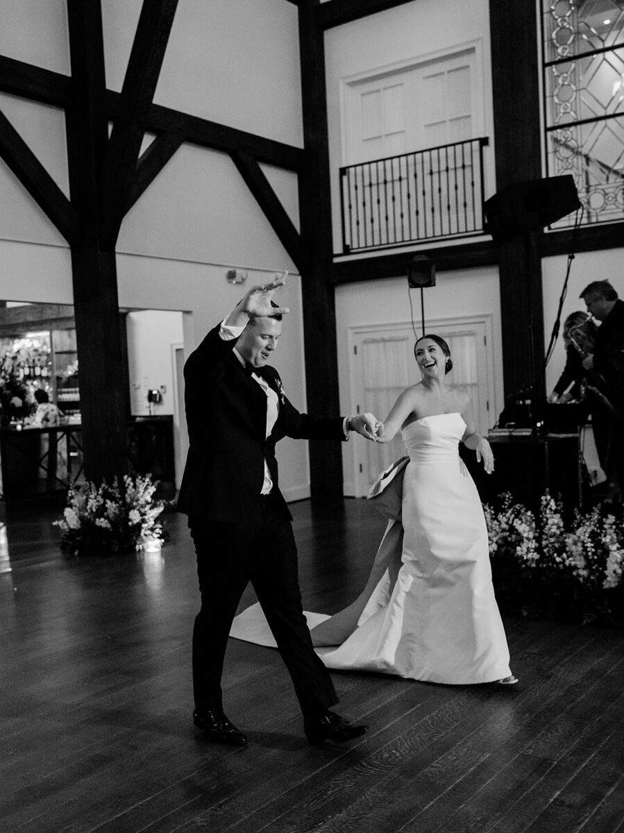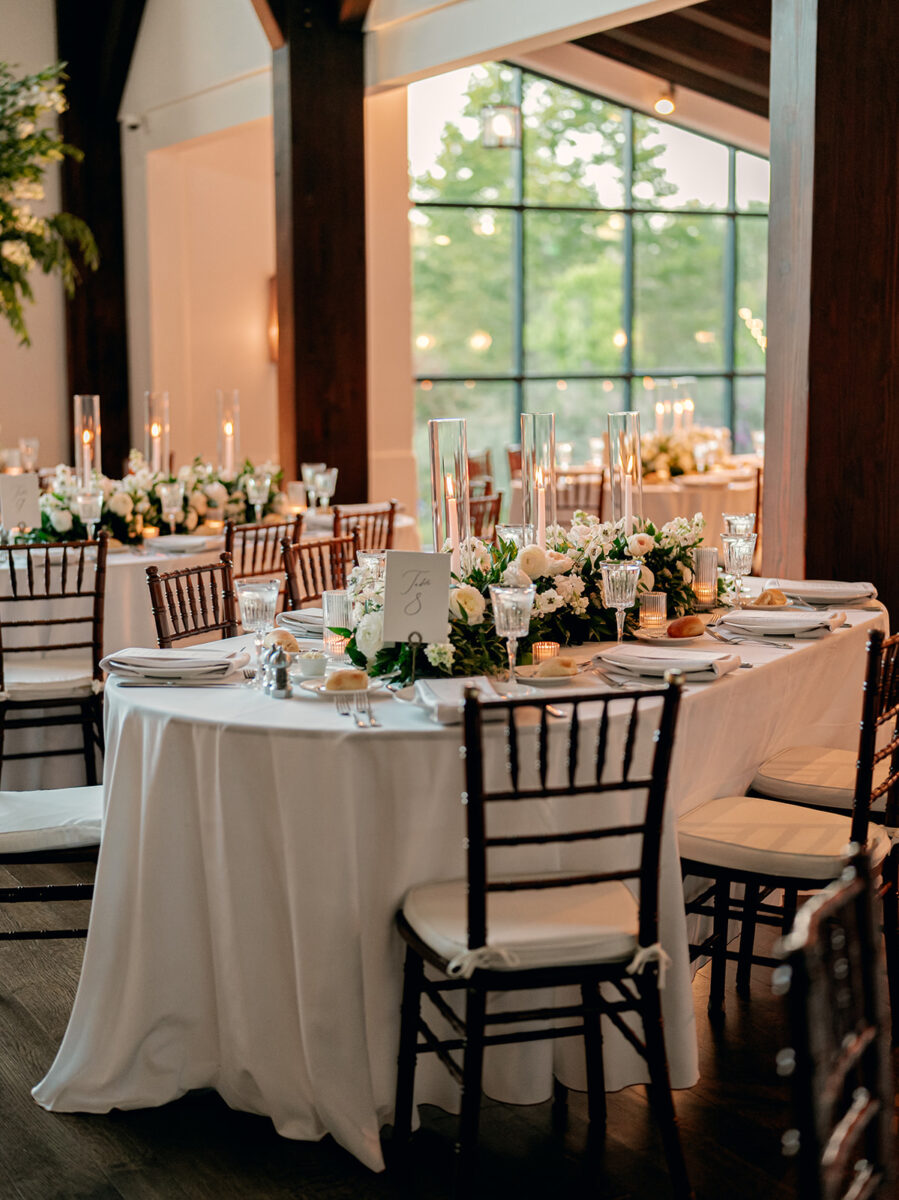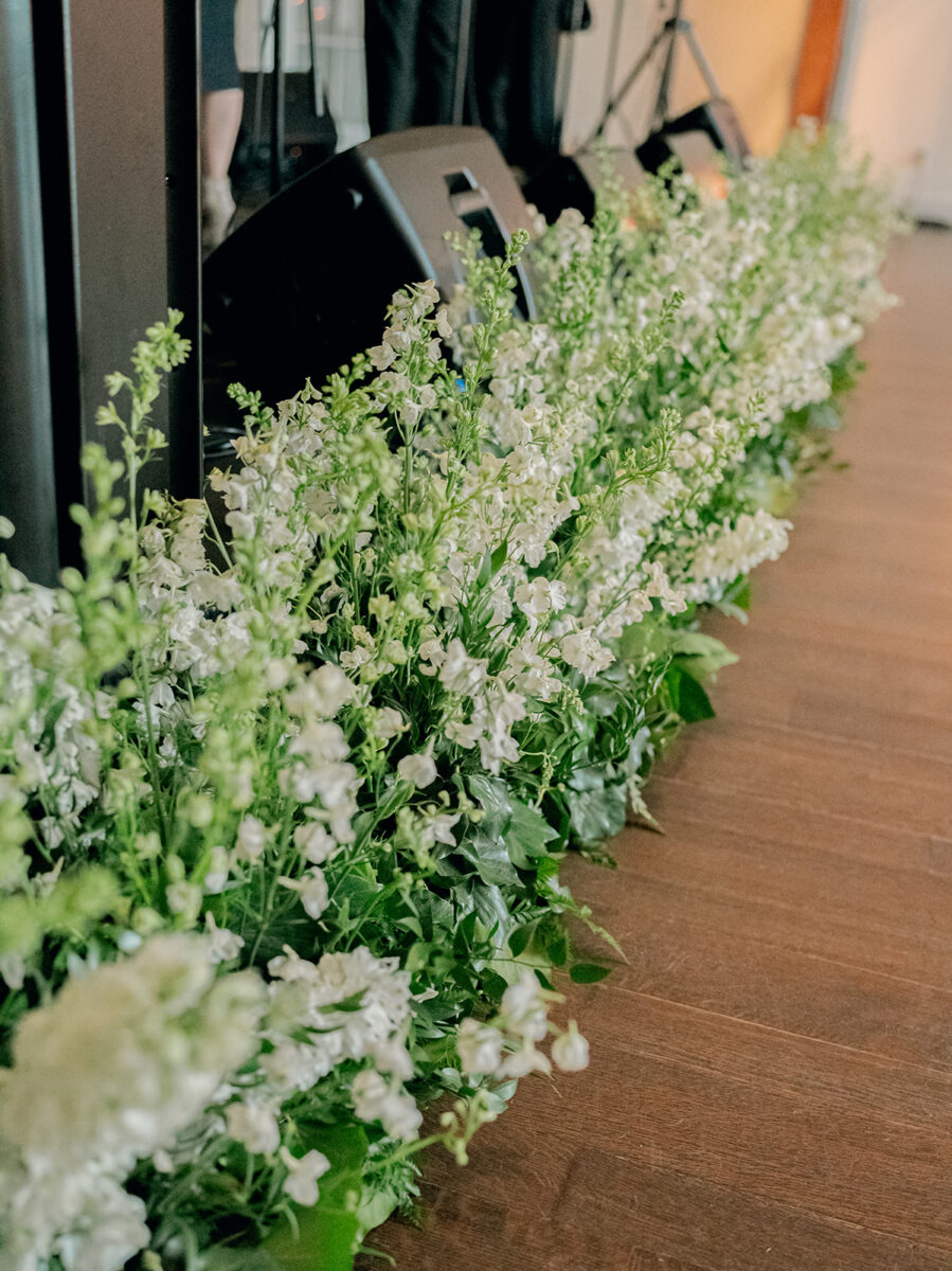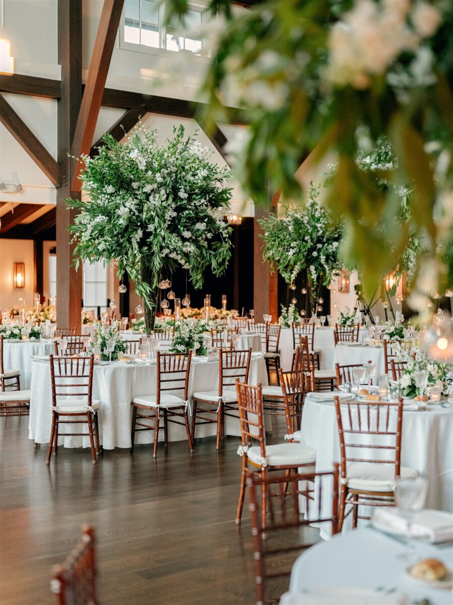 Stepping into the reception, the air was filled with the scent of fresh florals, with the space transformed with towering tree-like centerpieces of bay laurel, myrtle, Italian ruscus, white delphinium, orchids, and stock. Suspended candles cast a warm, romantic glow throughout the evening. A gravity-defying floral installation, by Crossed Keys Designs suspended above the sweetheart table. Hundreds of candles illuminated the reception, including the estate’s soaring 45-foot windows.