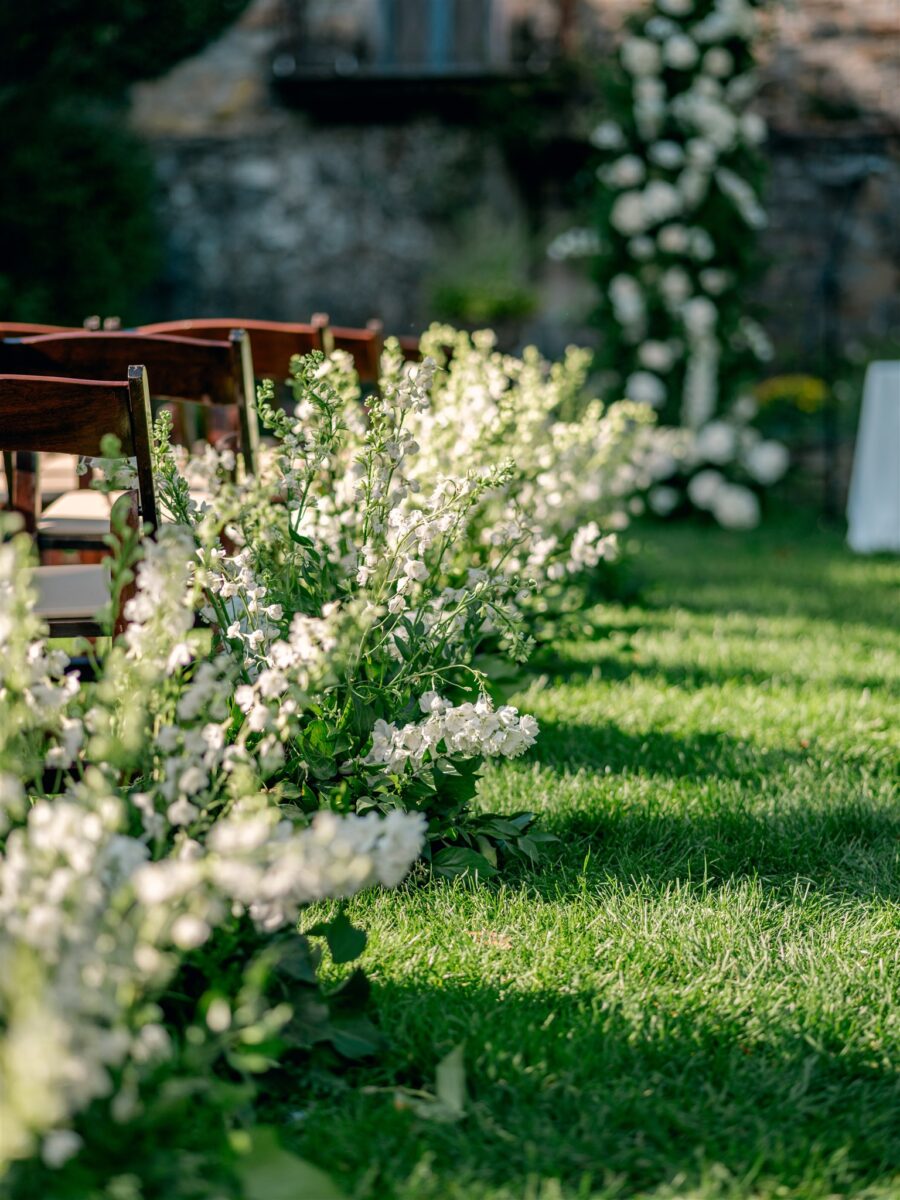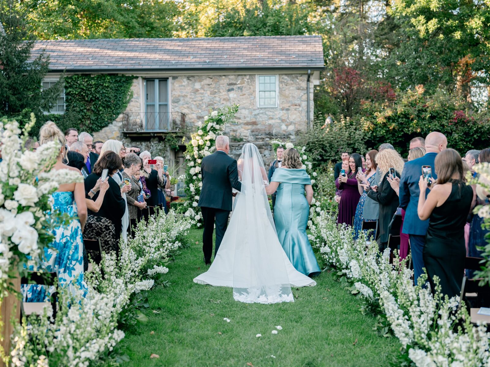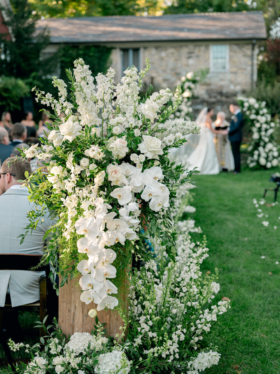 Set in the English Garden, the ceremony featured towering custom floral arbors and a aisle lined of delphinium sourced from Holland and South American, enveloping the couple in a sea of soft white blooms. A restored vintage carriage, made its way down the aisle, led by Kaite’s twin sister and niece.