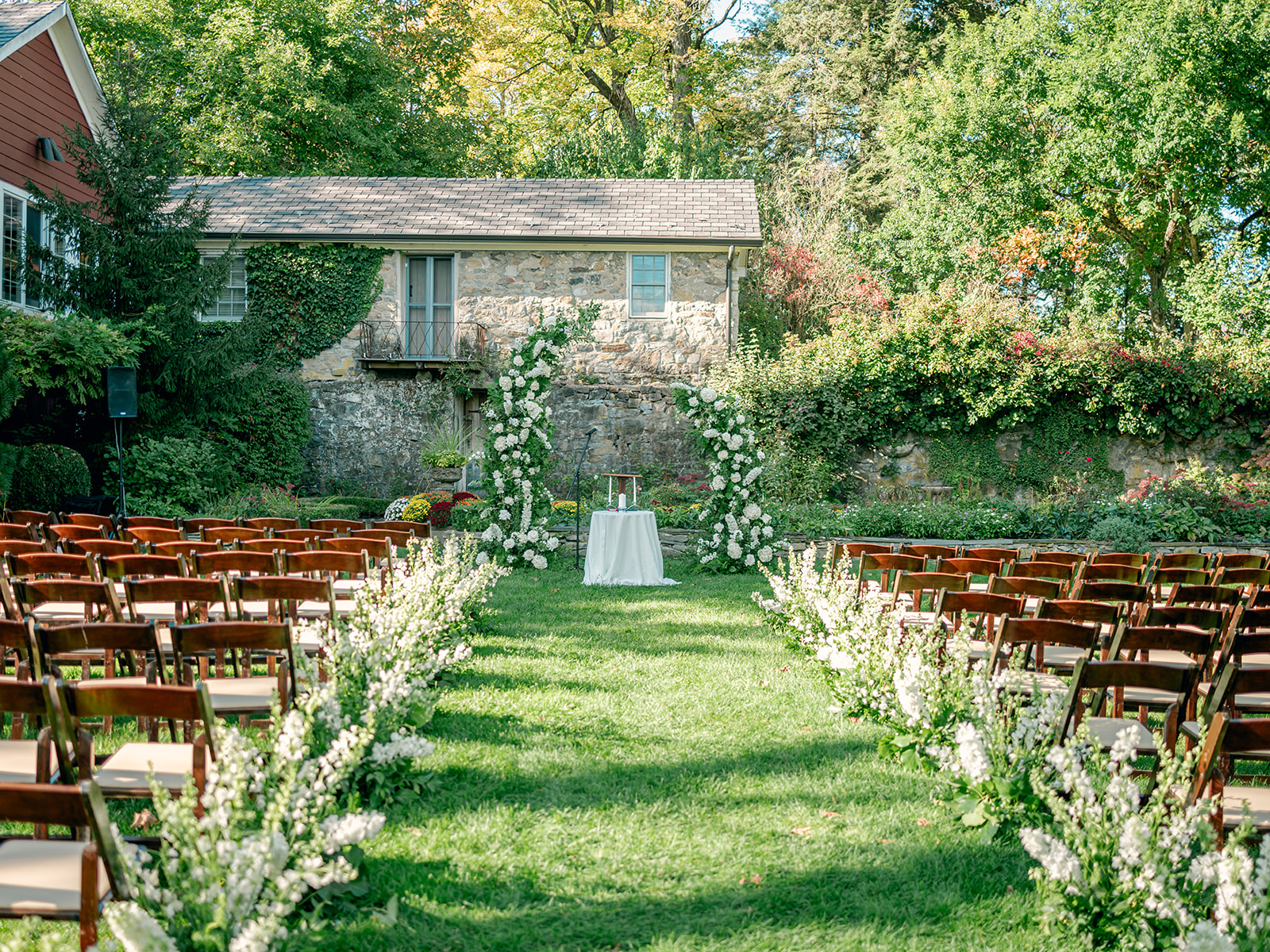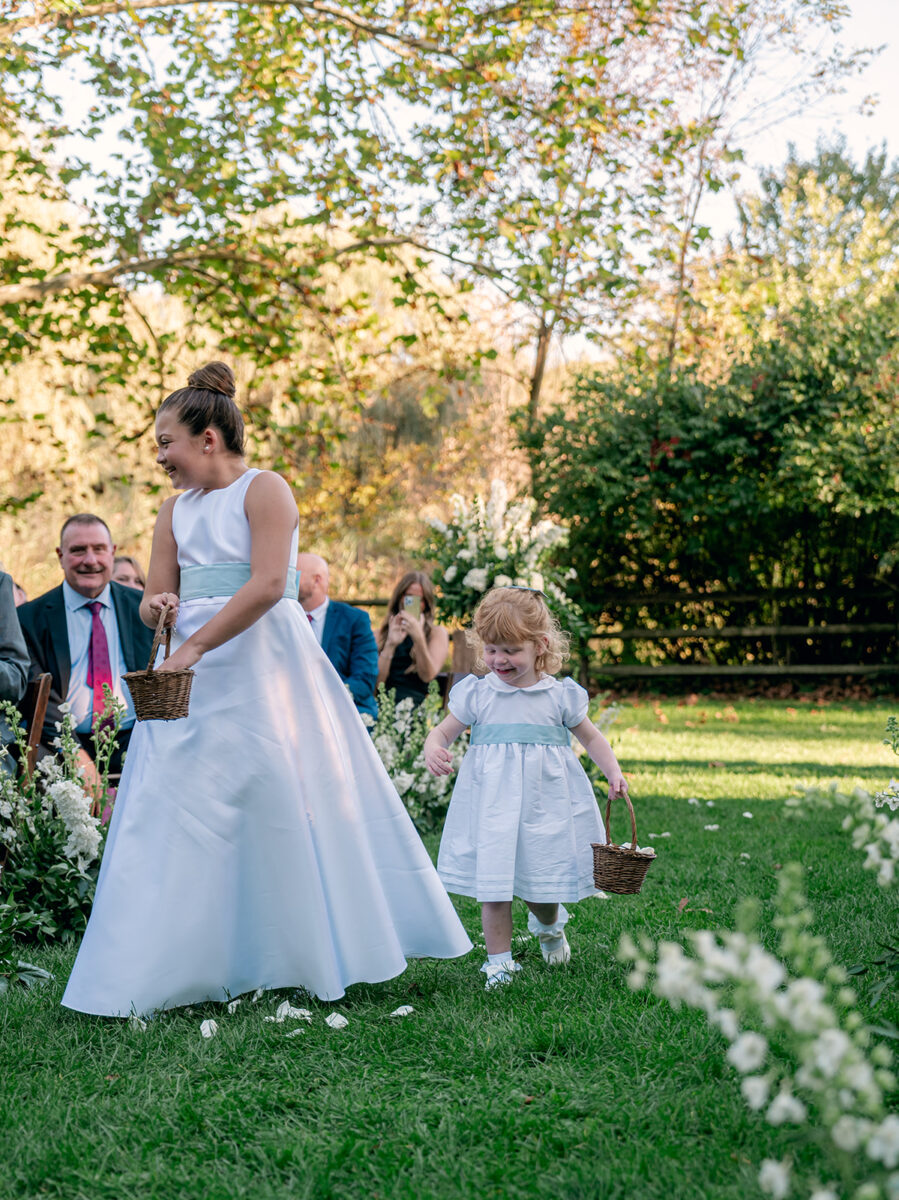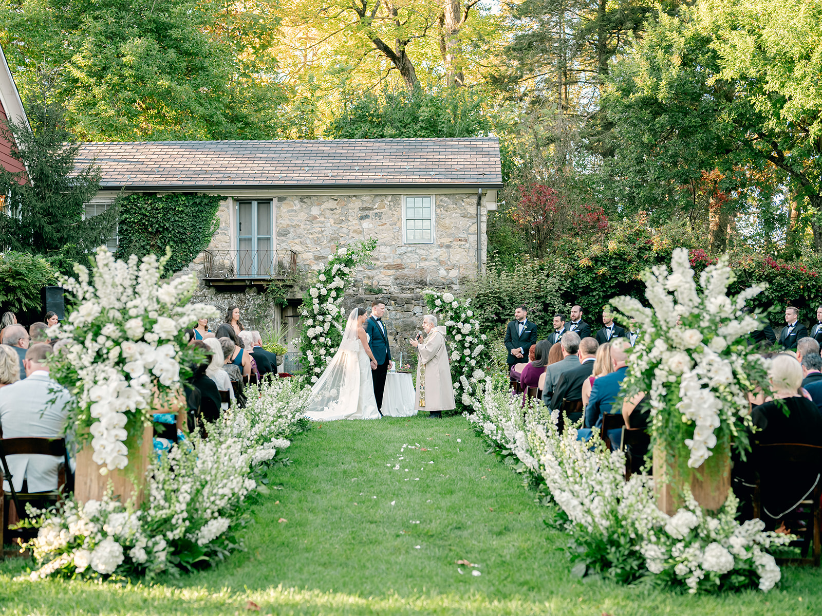 Set in the English Garden, the ceremony featured towering custom floral arbors and a aisle lined of delphinium sourced from Holland and South American, enveloping the couple in a sea of soft white blooms. A restored vintage carriage, made its way down the aisle, led by Kaite’s twin sister and niece.