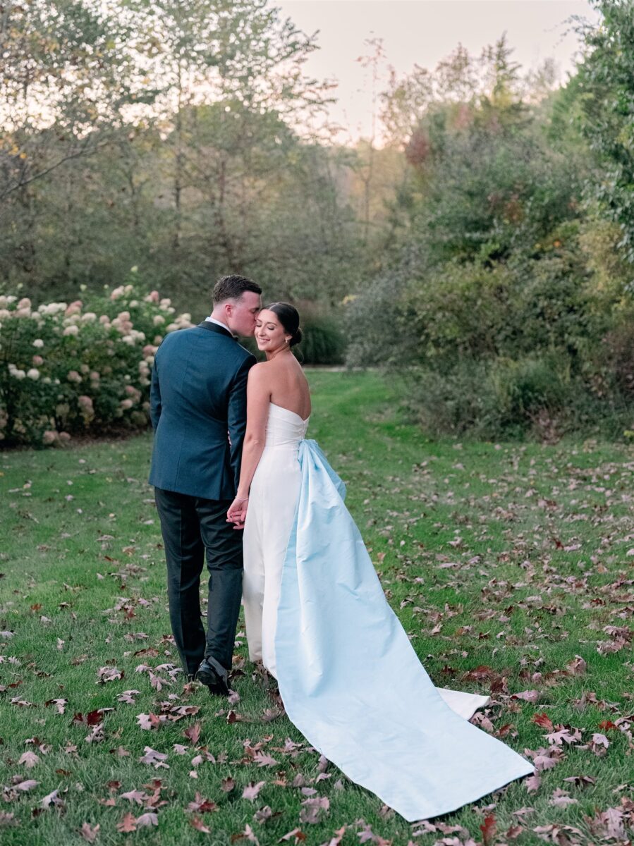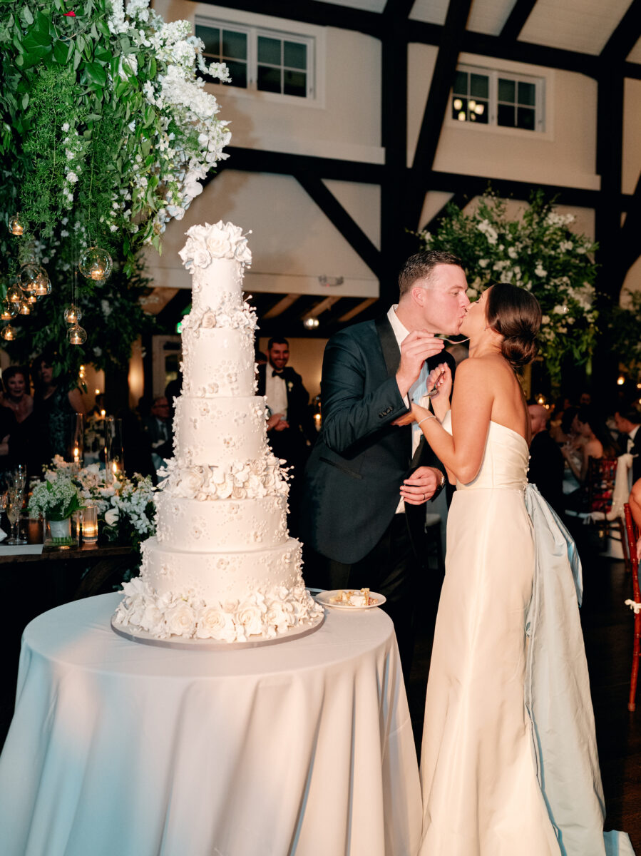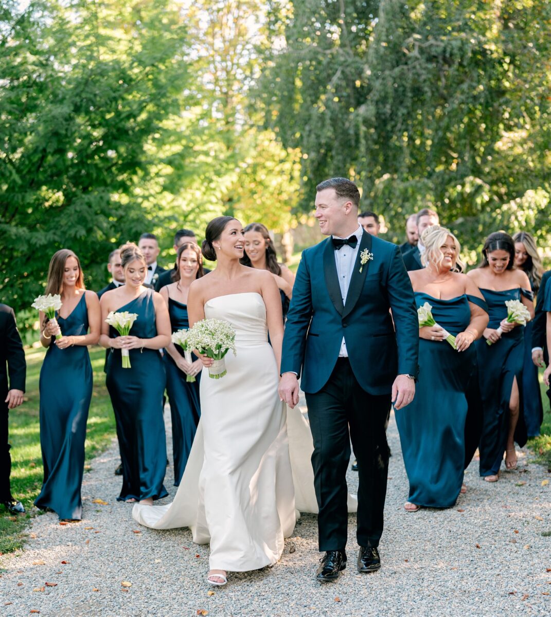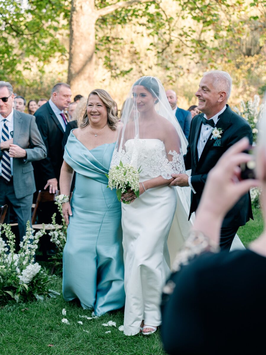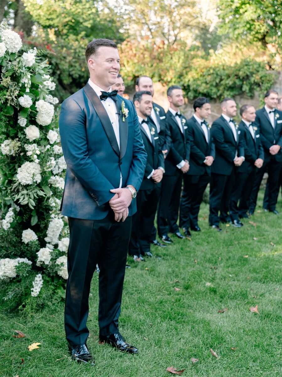 The day began in the estate’s private suites, where Prosecco flowed as the final details fell into place. Kaite in the Sareh Nouri Blue Moon Gown, featuring a sculpted bodice and an ethereal overskirt that she later transformed into a soft blue bow for the reception. Her cathedral-length lace-edged veil, perfectly complementing her sleek bun. John, dressed in a tailored tux with a navy suit jacket, his boutonnière a nod to Kaite’s favorite flower—lily of the valley, which matched her silk-wrapped bouquet.
