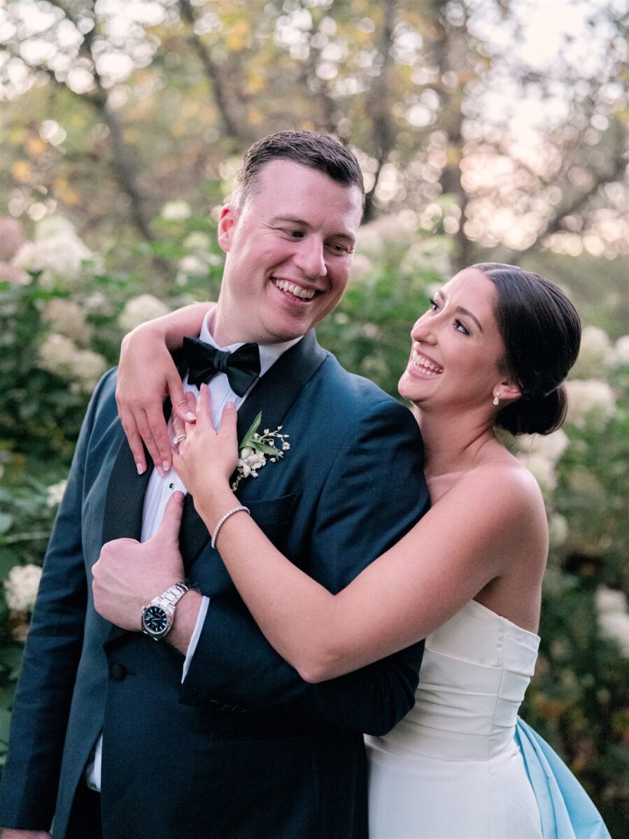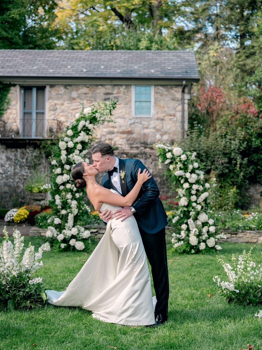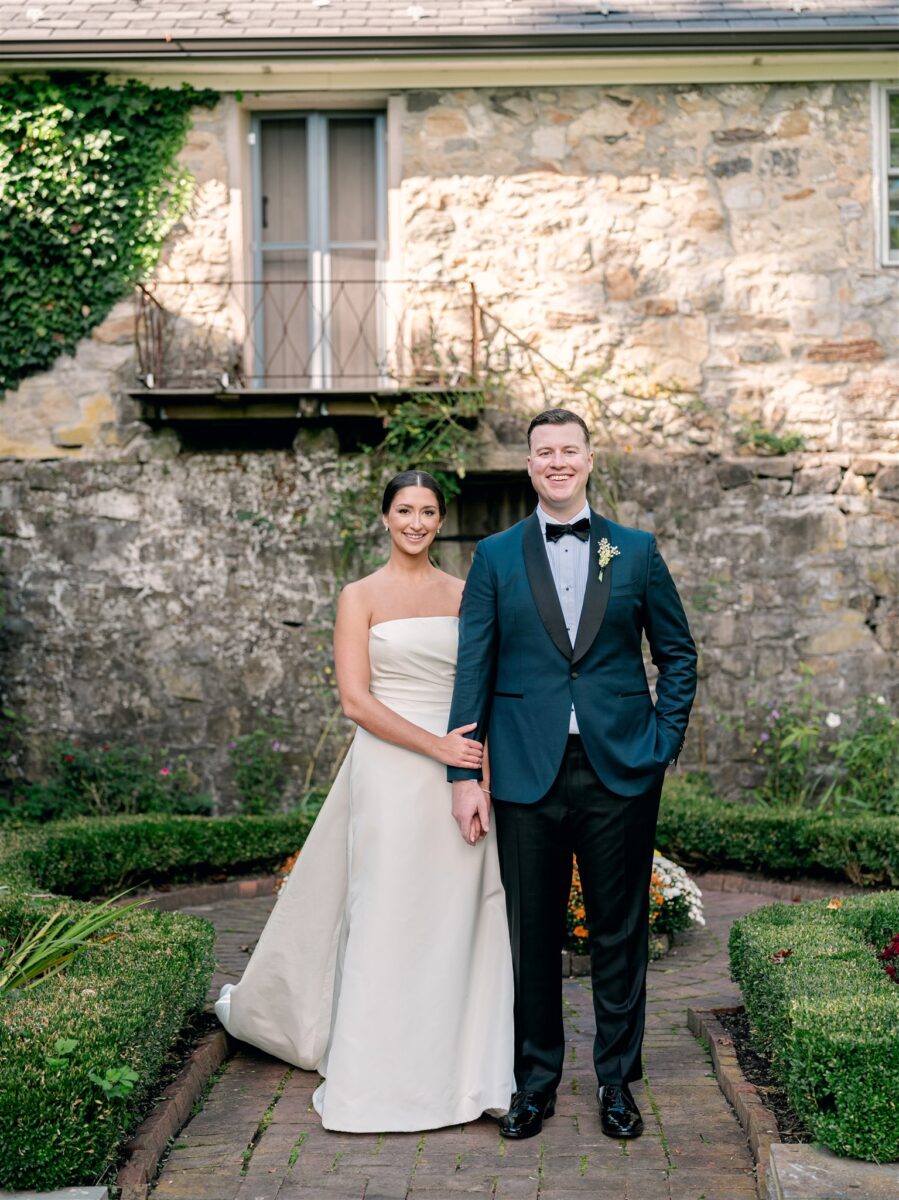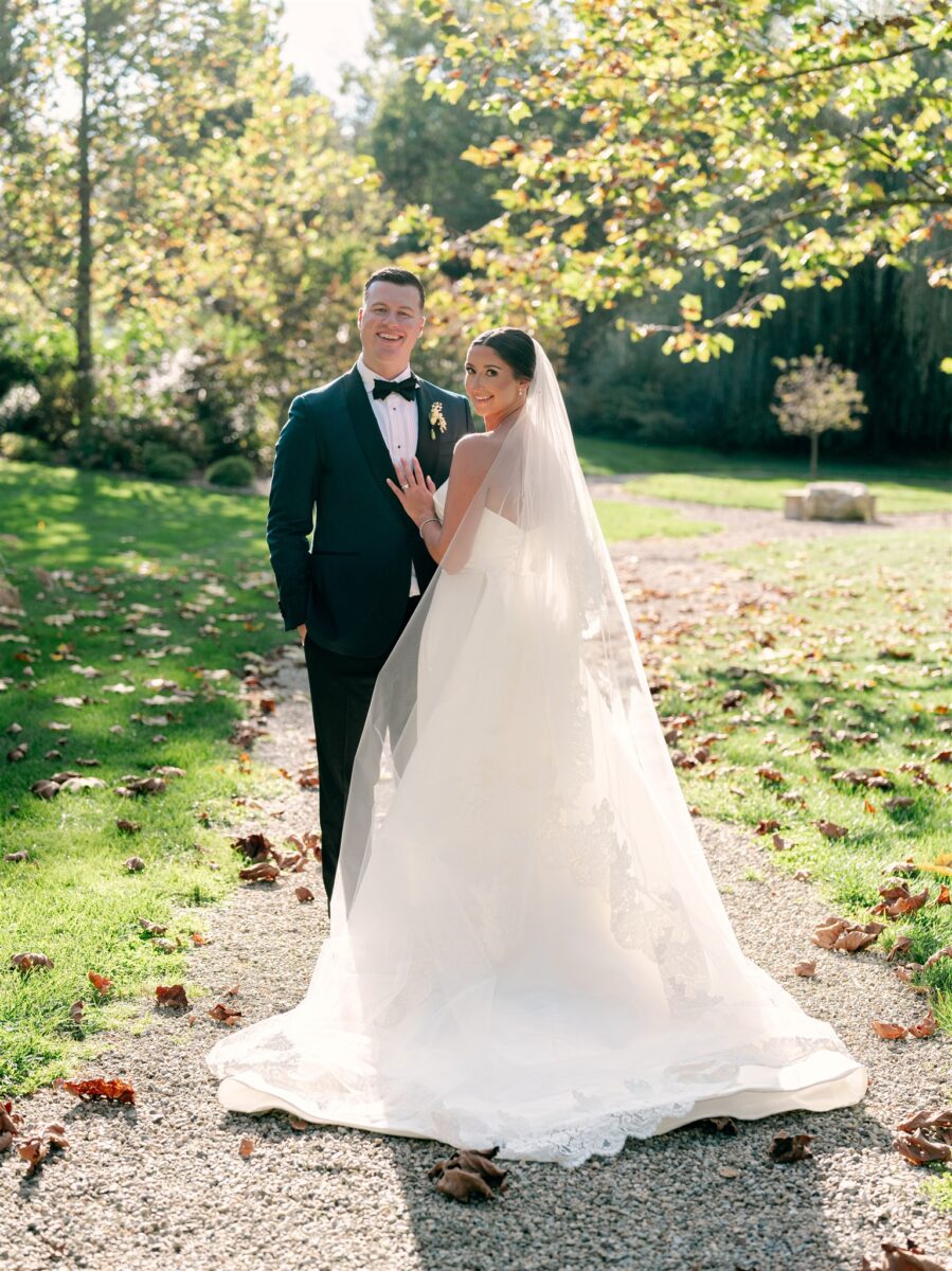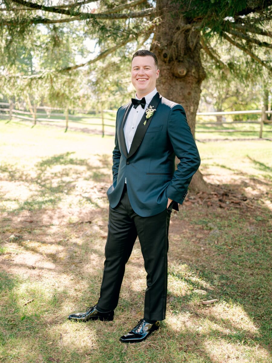 The day began in the estate’s private suites, where Prosecco flowed as the final details fell into place. Kaite in the Sareh Nouri Blue Moon Gown, featuring a sculpted bodice and an ethereal overskirt that she later transformed into a soft blue bow for the reception. Her cathedral-length lace-edged veil, perfectly complementing her sleek bun. John, dressed in a tailored tux with a navy suit jacket, his boutonnière a nod to Kaite’s favorite flower—lily of the valley, which matched her silk-wrapped bouquet.