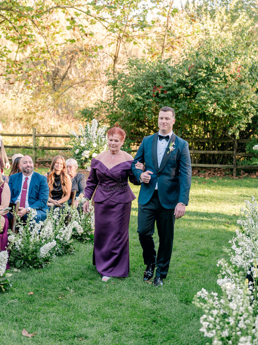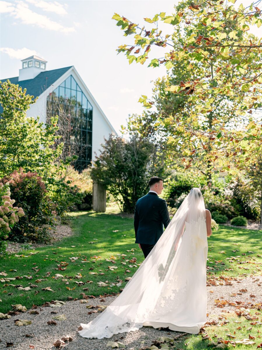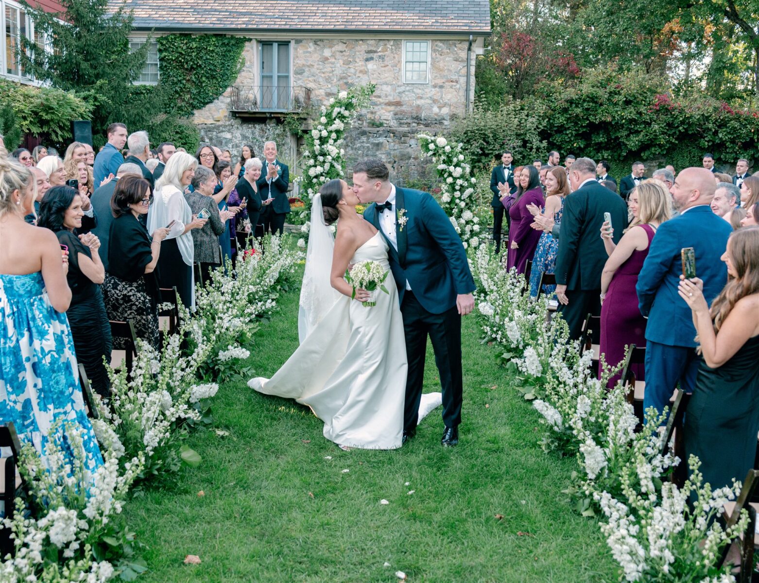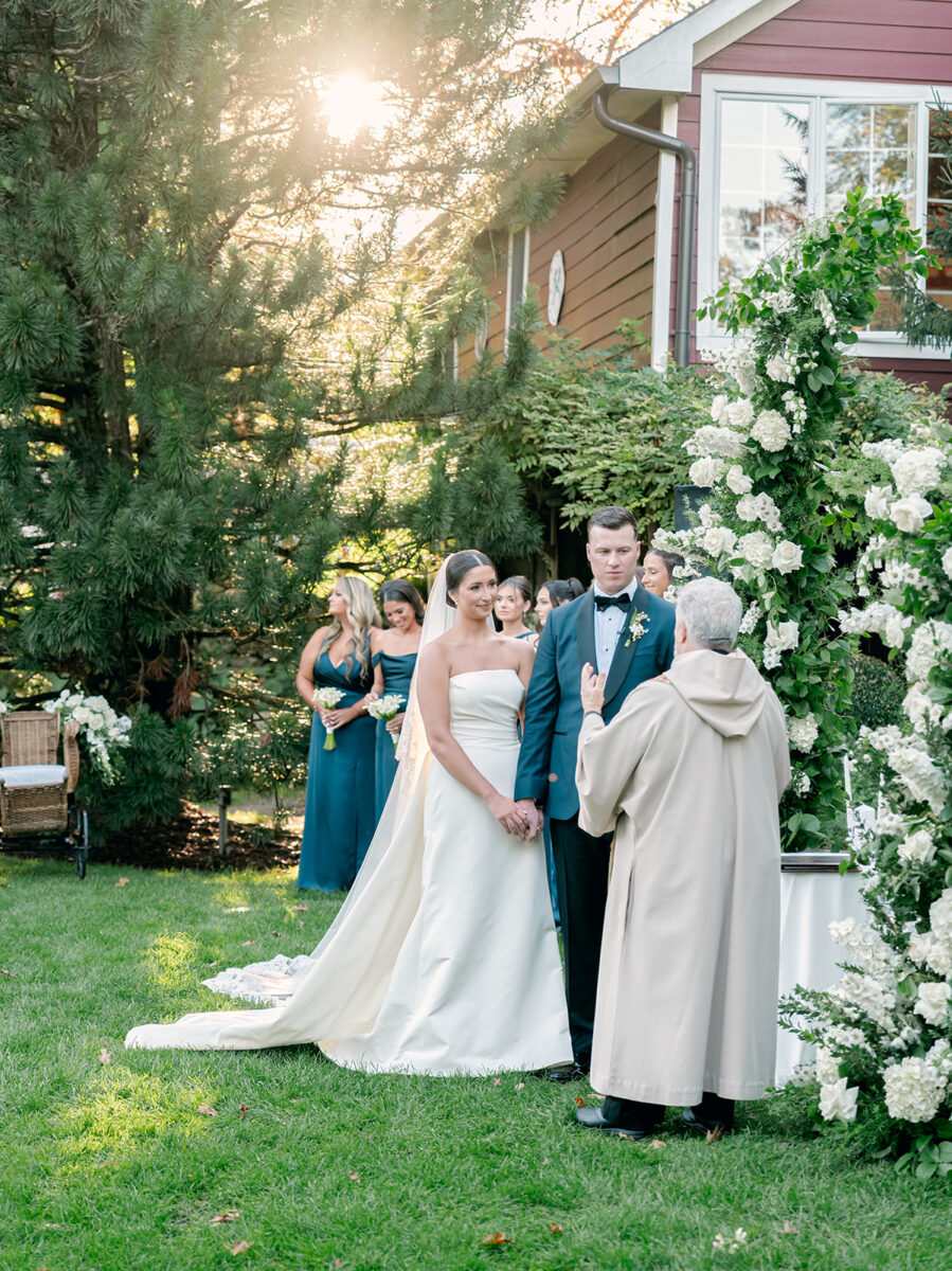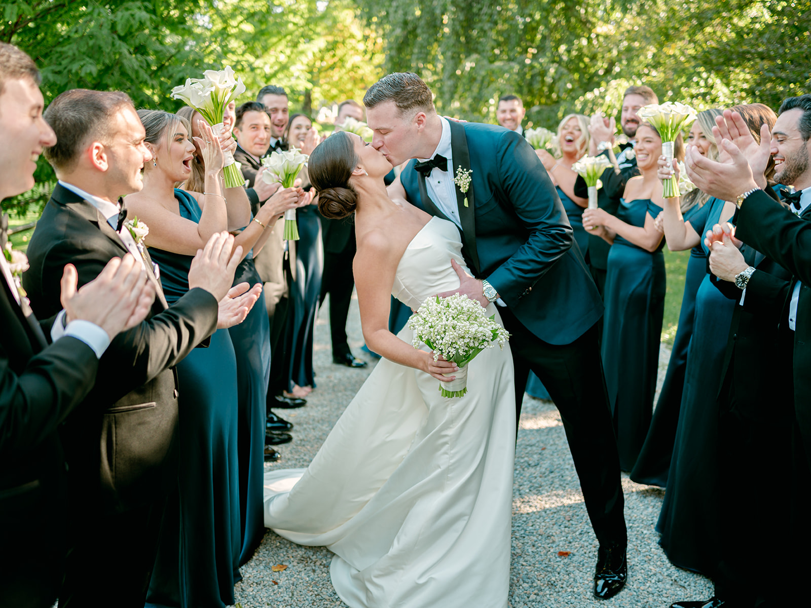 The day began in the estate’s private suites, where Prosecco flowed as the final details fell into place. Kaite in the Sareh Nouri Blue Moon Gown, featuring a sculpted bodice and an ethereal overskirt that she later transformed into a soft blue bow for the reception. Her cathedral-length lace-edged veil, perfectly complementing her sleek bun. John, dressed in a tailored tux with a navy suit jacket, his boutonnière a nod to Kaite’s favorite flower—lily of the valley, which matched her silk-wrapped bouquet.