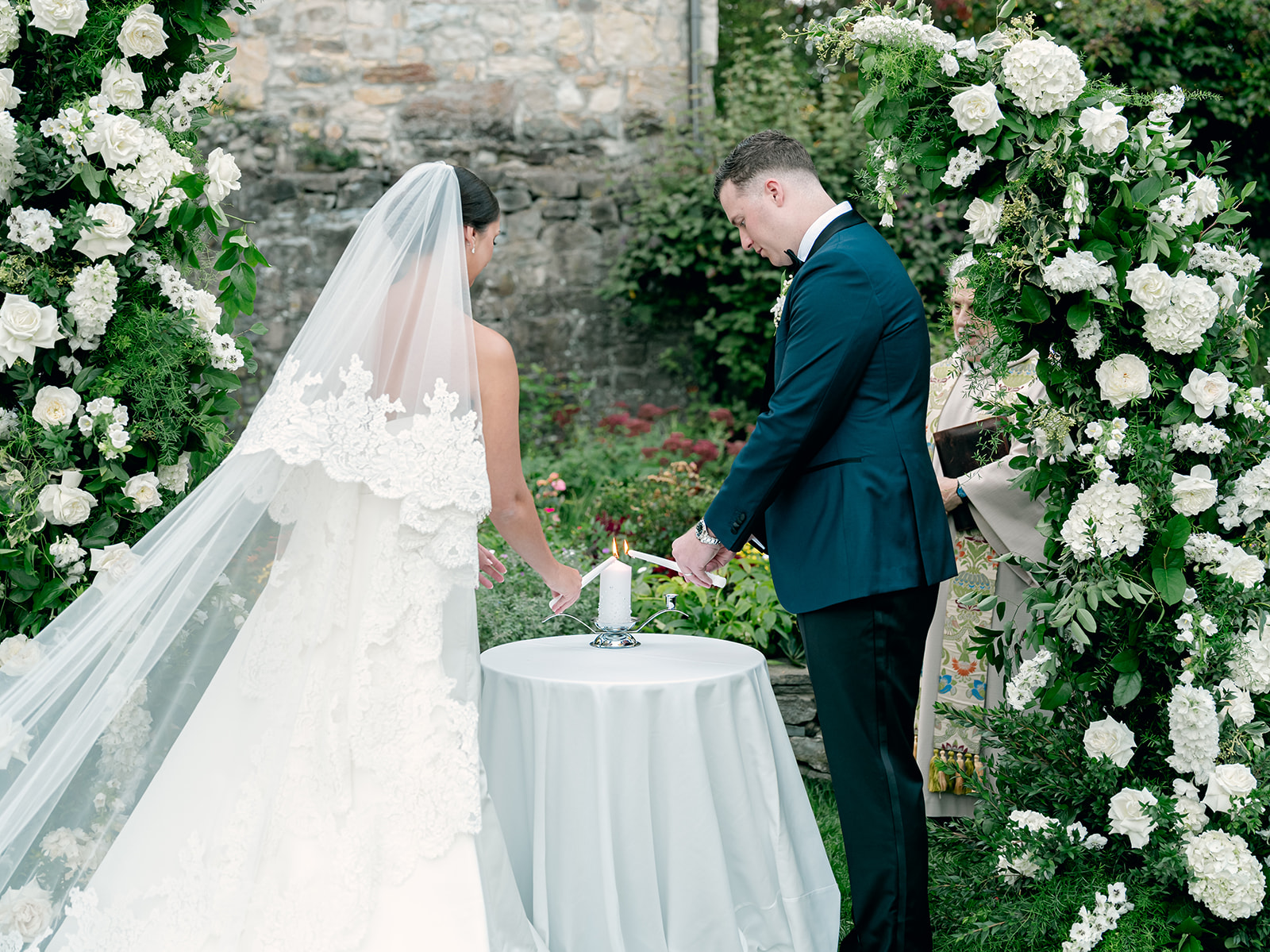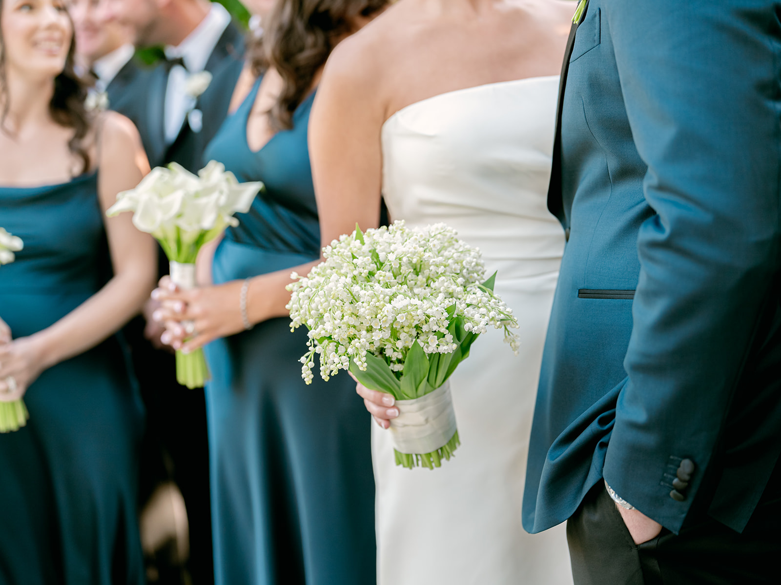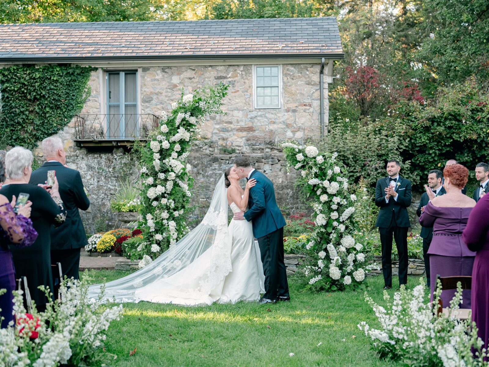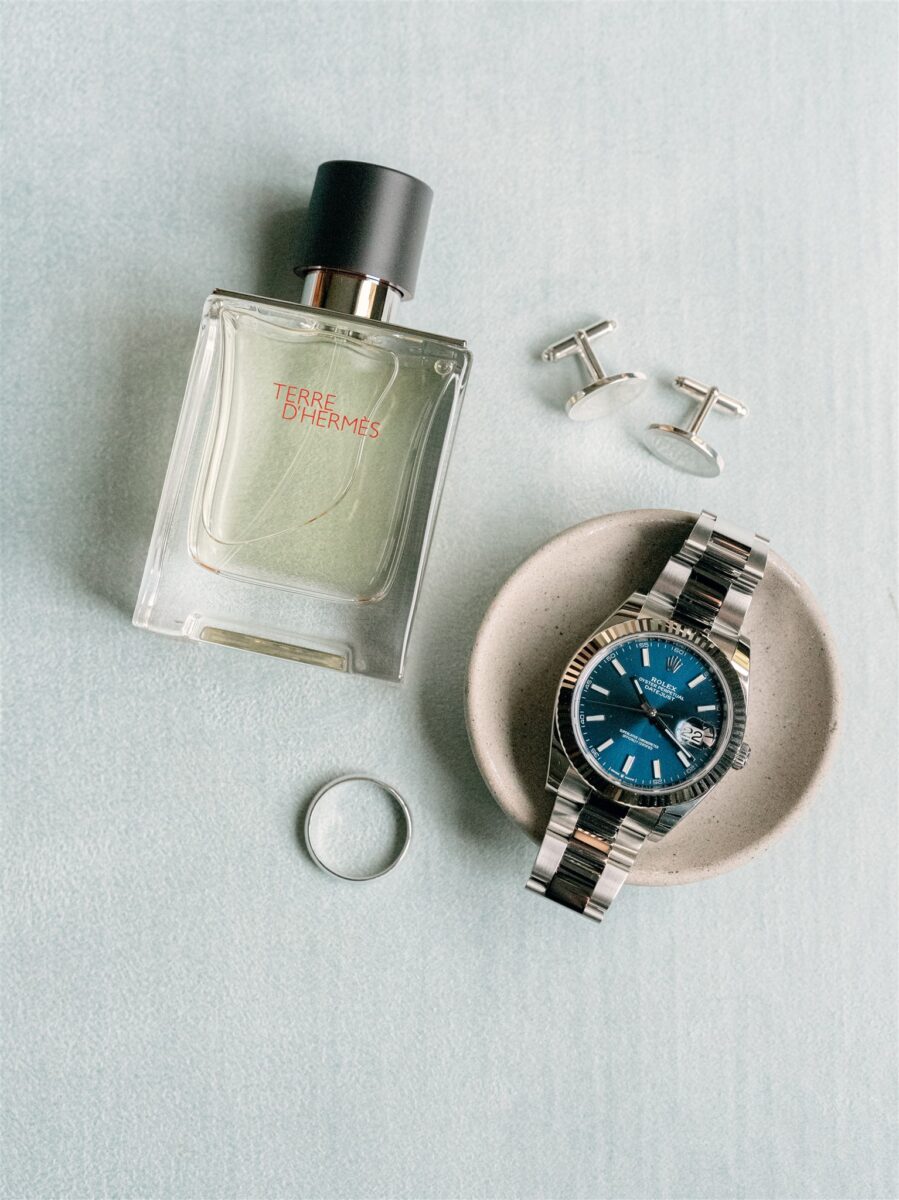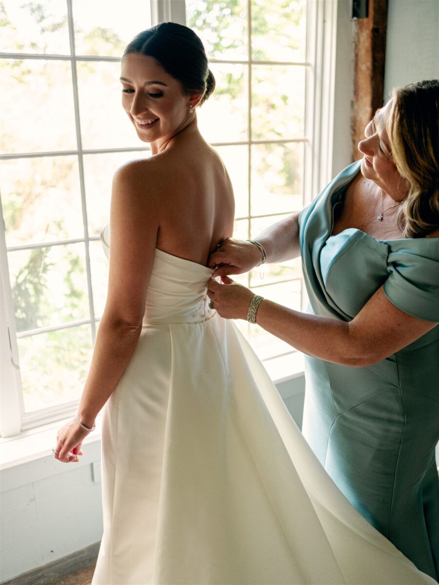 The day began in the estate’s private suites, where Prosecco flowed as the final details fell into place. Kaite in the Sareh Nouri Blue Moon Gown, featuring a sculpted bodice and an ethereal overskirt that she later transformed into a soft blue bow for the reception. Her cathedral-length lace-edged veil, perfectly complementing her sleek bun. John, dressed in a tailored tux with a navy suit jacket, his boutonnière a nod to Kaite’s favorite flower—lily of the valley, which matched her silk-wrapped bouquet.