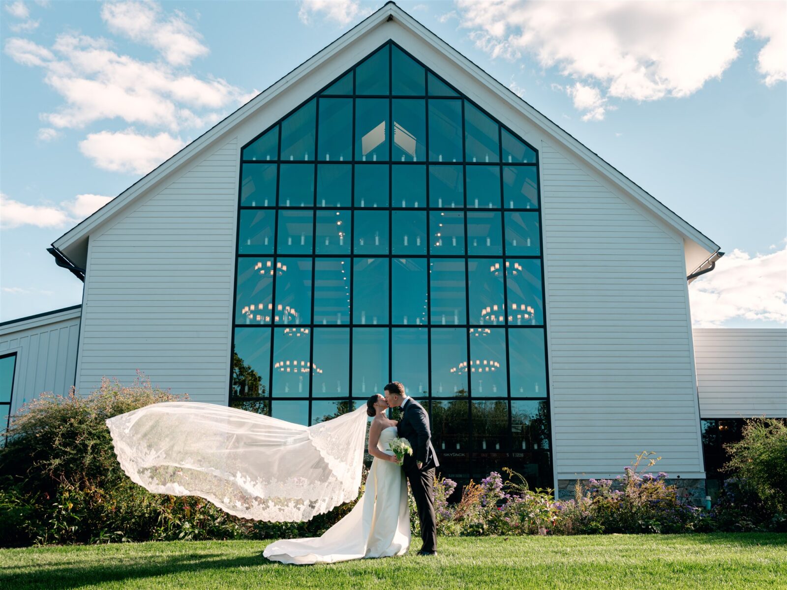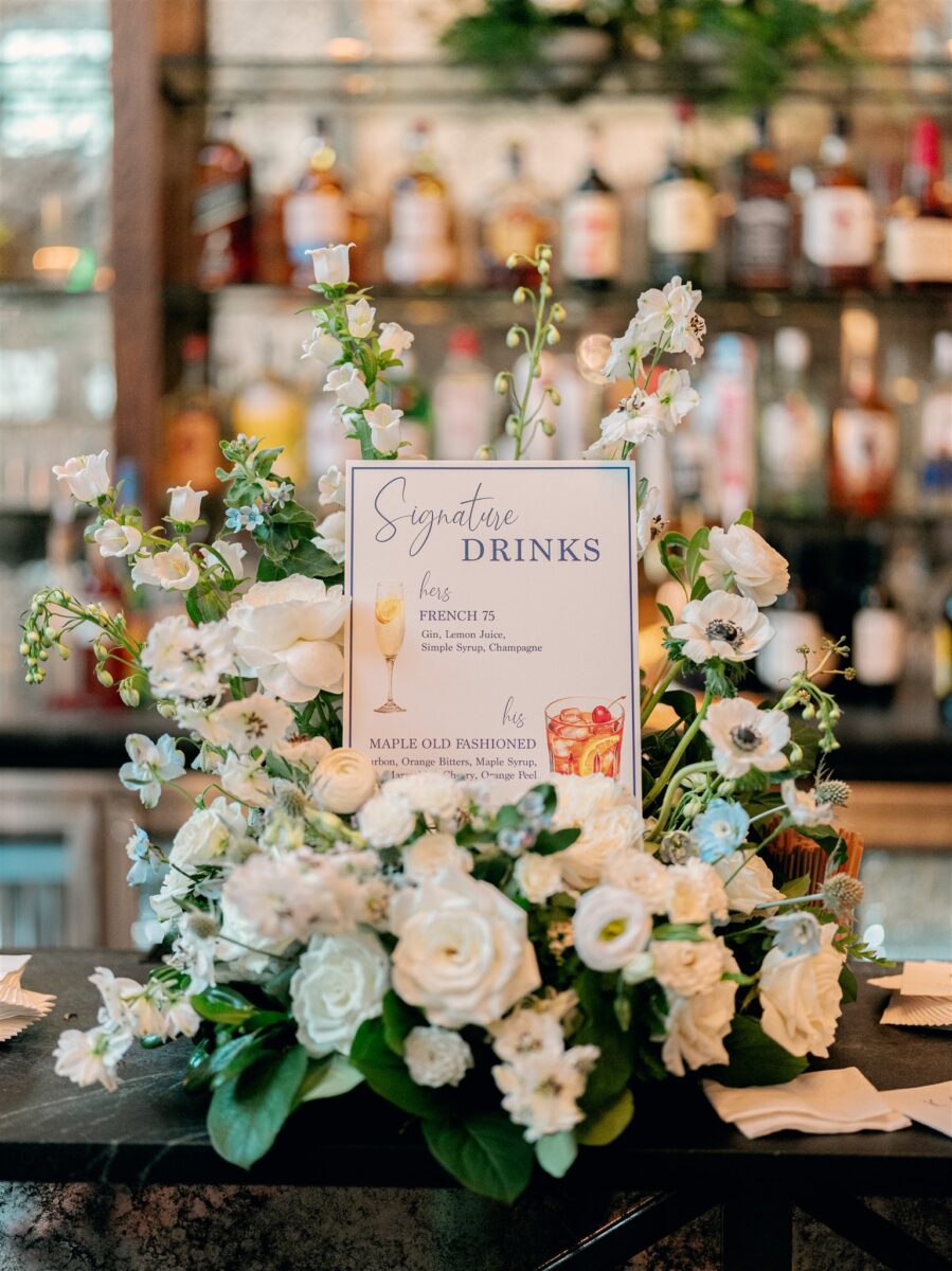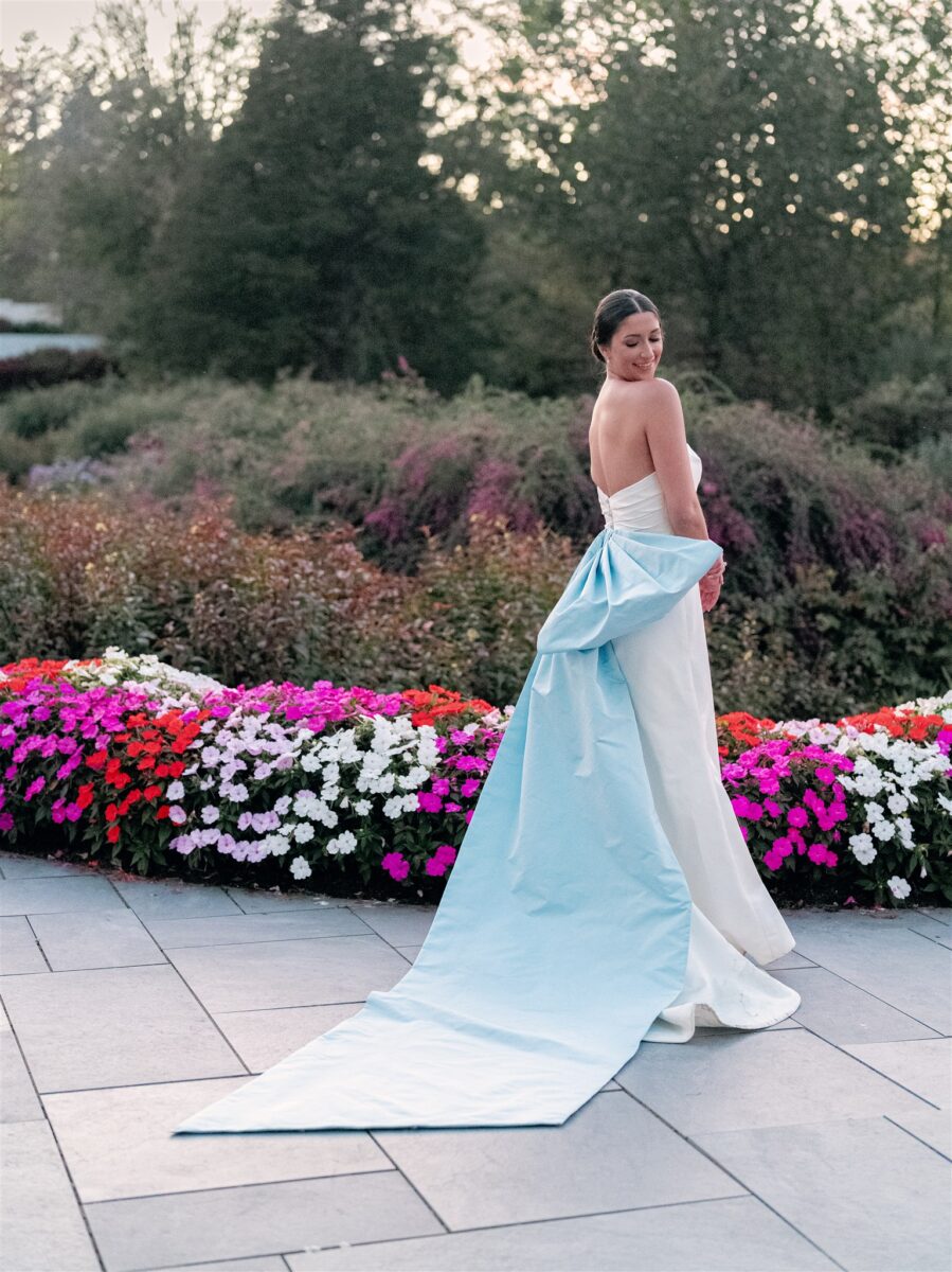 Cocktail hour flowed seamlessly from the garden to the glass conservatory, where Kaite revealed her oversized blue bow train—a modern take on the something blue tradition. Guests sipped signature cocktails and indulged in gourmet hors d’oeuvres while taking in the views from the indoor-outdoor space.