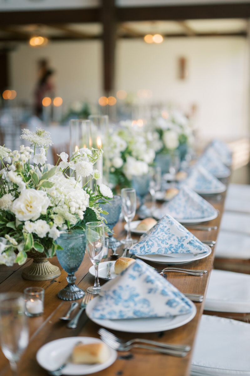 Being onsite, our team knows how to customize the space and enhance the unique features of the venue. Add charming beam vines or hanging wisteria to the farmhouse to create a whimsical vibe, or give the room a glow with elegant candle tablescapes. We have special equipment to hang vines up the beams, chandeliers, and even place real lit candles in the windows 40 feet up, creating a breathtaking ambiance that outside florists simply can’t offer.