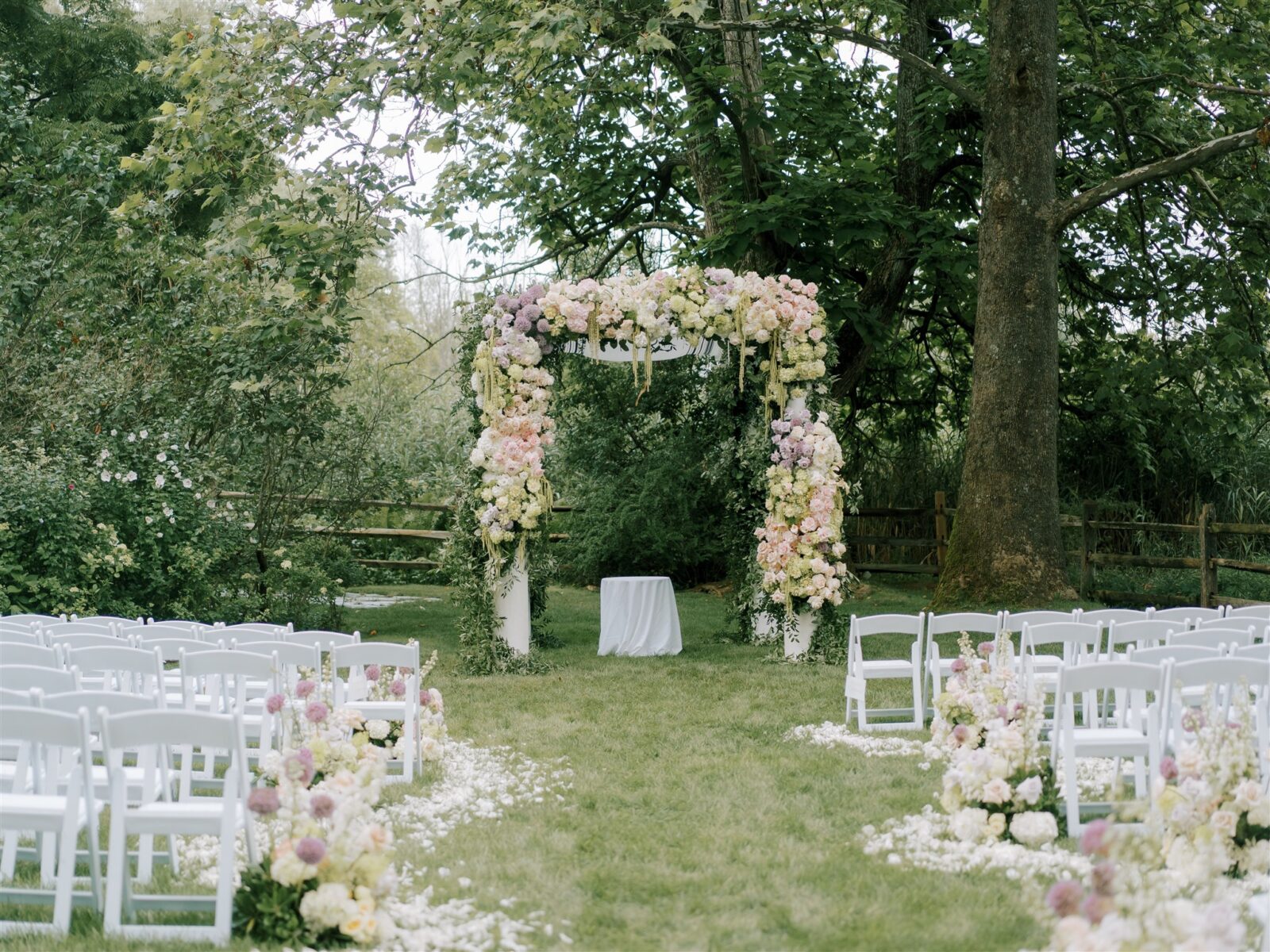 Our team can repurpose floral arrangements from your ceremony to your reception, maximizing your floral investment and maintaining a cohesive aesthetic throughout your event. Unlike offsite florists that drop arrangements off the morning of, our onsite team can repurpose your ceremony florals by moving aisle markers in front of your sweetheart table, the band’s stage, or even as centerpieces. Please note that a small repurposing fee applies for this service.