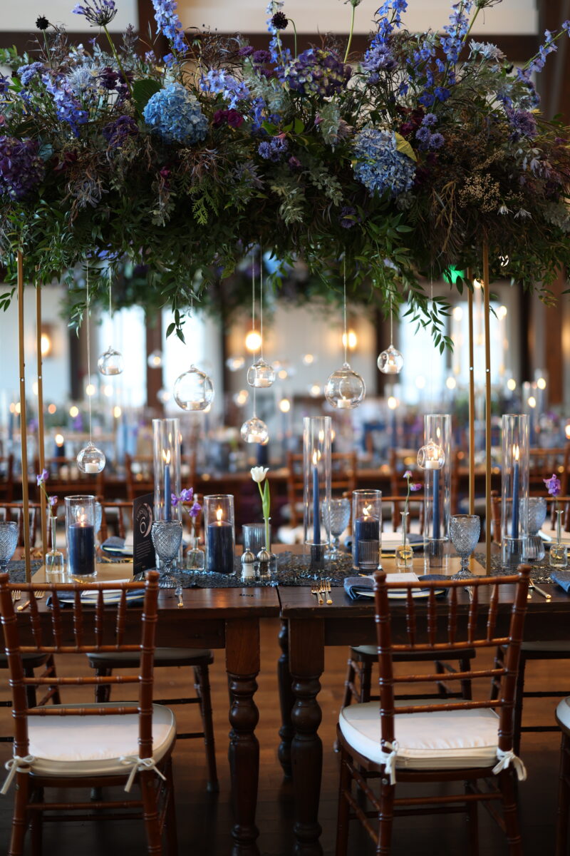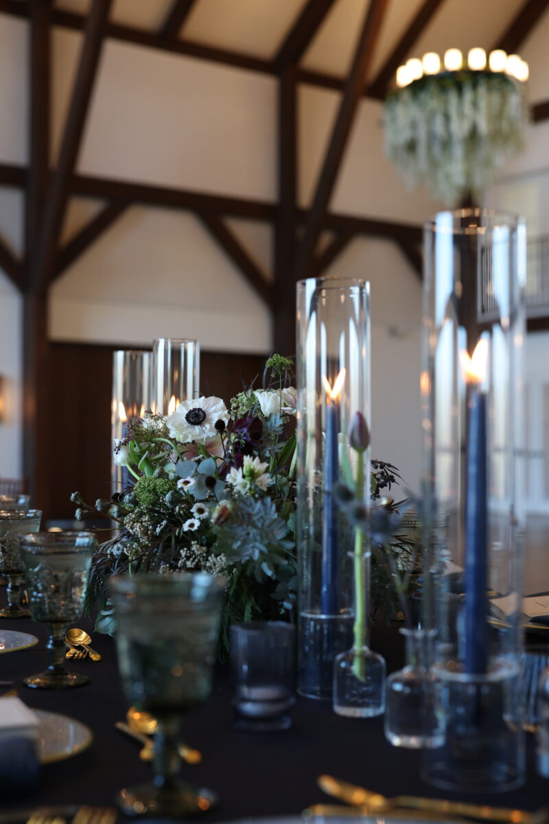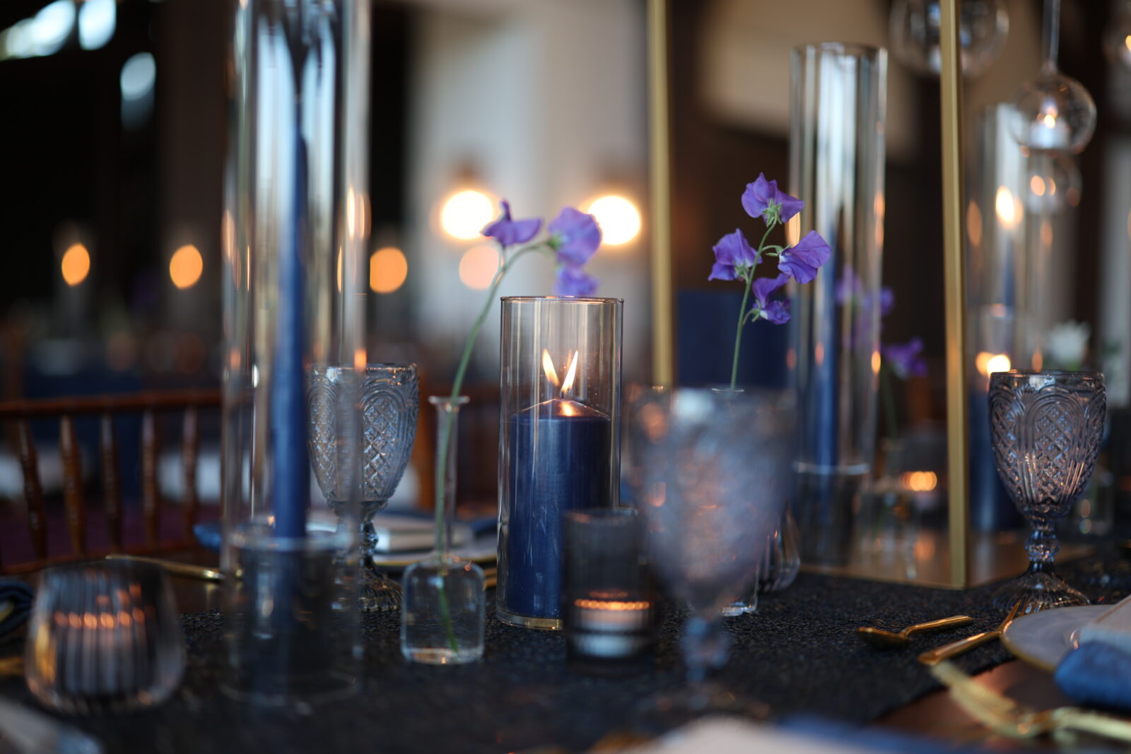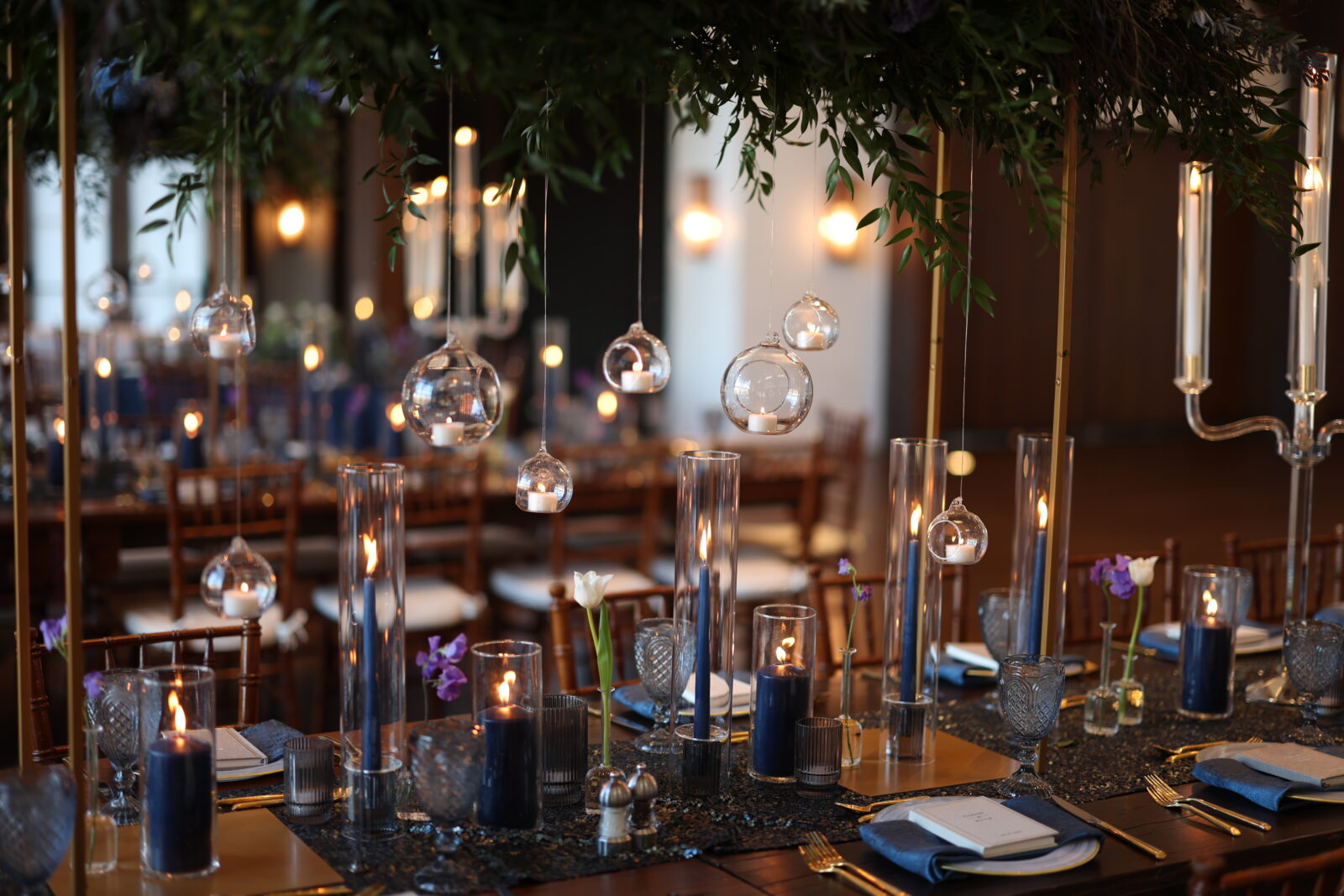 For couples seeking timeless sophistication with a moody edge, midnight blue offers a rich alternative to classic black-and-white. Pair this elegant hue with gold or softer tones like blush pink or beige for a balanced, romantic palette. Midnight blue can shine in table linens, taper candles, or velvet accents. Floral Pairings: While true blue flowers are rare, incorporate deep blue delphiniums, hydrangeas, eryngium (blue thistle), and anemones with white petals and dark centers for a striking contrast.